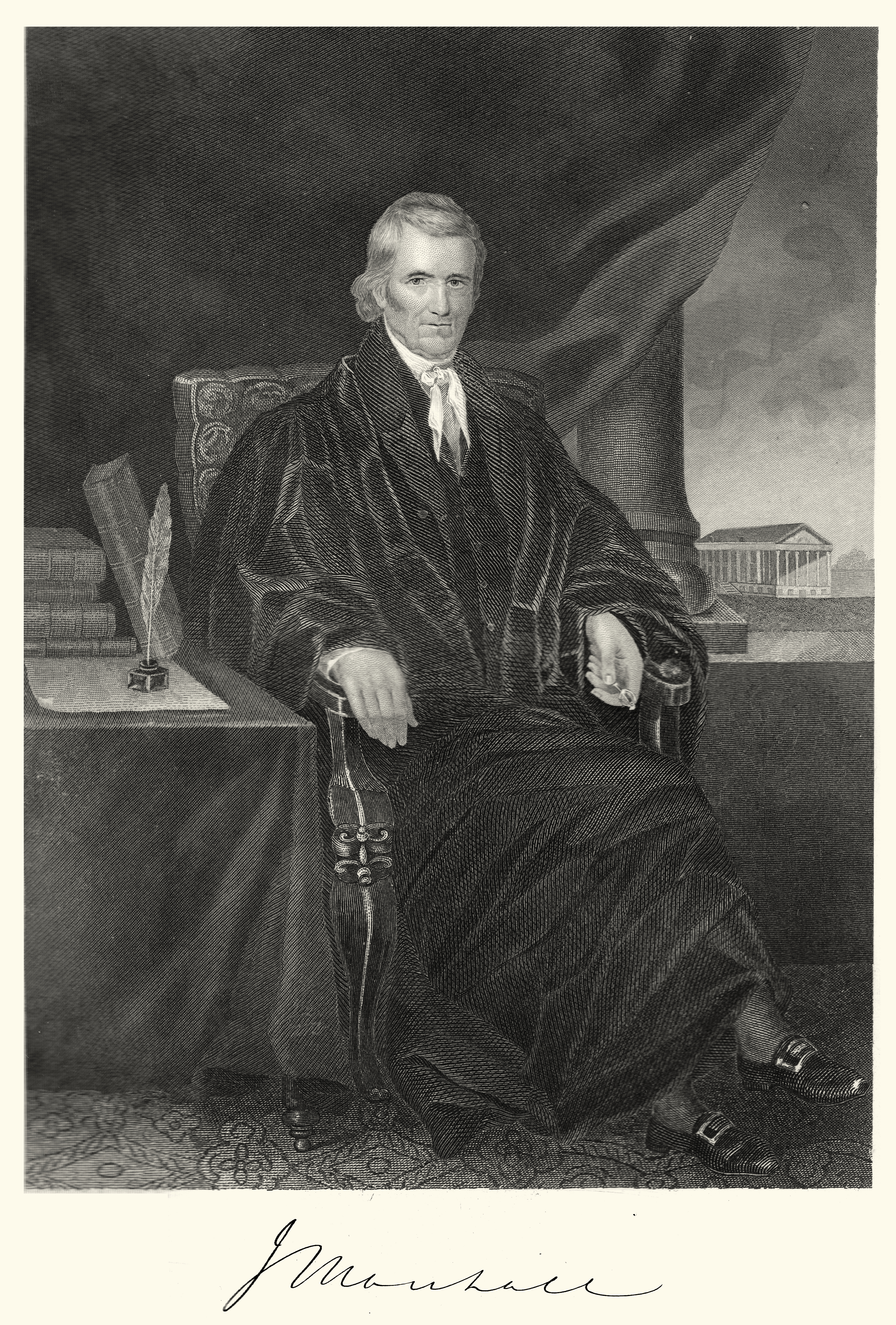 마셜은 제2대 대통령 존 애덤스에 의해 1801년 1월 31일 대법원장에 임명되었다.[57][58] 대법원에서 마셜은 헌법 해석을 통해 연방의 권한을 보장하고, 연방 사법부와 헌법의 권위 확립에 큰 기여를 했다. 그는 일련의 역사적인 여러 판결을 통해 당시 매우 약체였던 사법부를 의회(입법부)와 대통령 (행정부)과 동등한 영향력을 가지는 독립적 지위로 높여가는 첫 걸음 디뎠다.