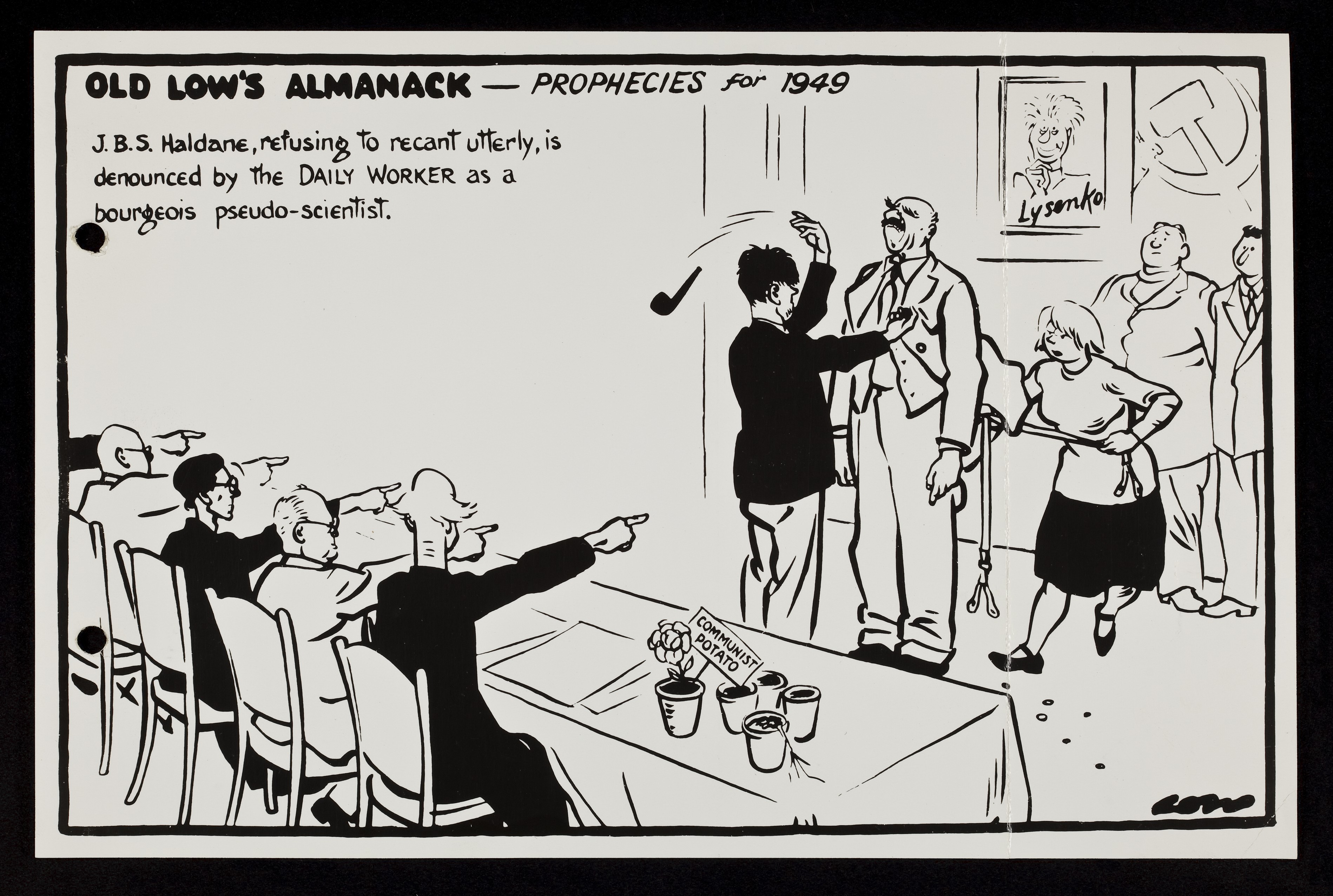 1950년, 트로핌 리센코와 스탈린 독재의 희생양이 된 생물학자 니콜라이 바빌로프의 비극을 알게 된 후, 공산당을 탈당했다. 제2차 세계 대전 말 무렵, 홀데인은 소련 정권에 대한 명백한 비판자가 되었다.[71]