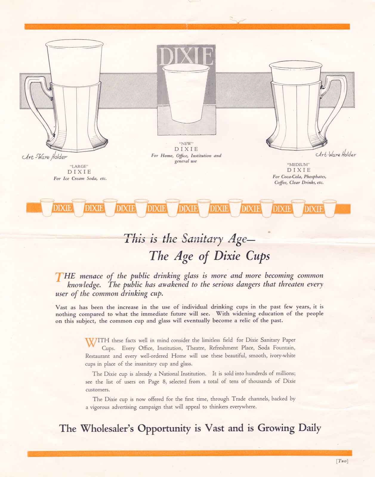 1910년, 휴 무어와 로렌스 루엘렌은 '딕시 컵(Dixie Cup)'이라는 브랜드 이름으로 종이컵을 상용화했다. 딕시 컵은 처음에는 "헬스 컵(Health Kup)"이라고 불렸지만, 1919년부터 뉴욕주의 알프레드 신들러의 Dixie Doll Company에서 제작한 인형 라인의 이름을 따서 현재의 이름으로 변경되었다.[11] 1957년, 딕시 컵은 American Can Company와 합병되었다. 1969년, 그래픽 디자이너 솔 바스가 딕시 컵 로고를 제작했다.[12]