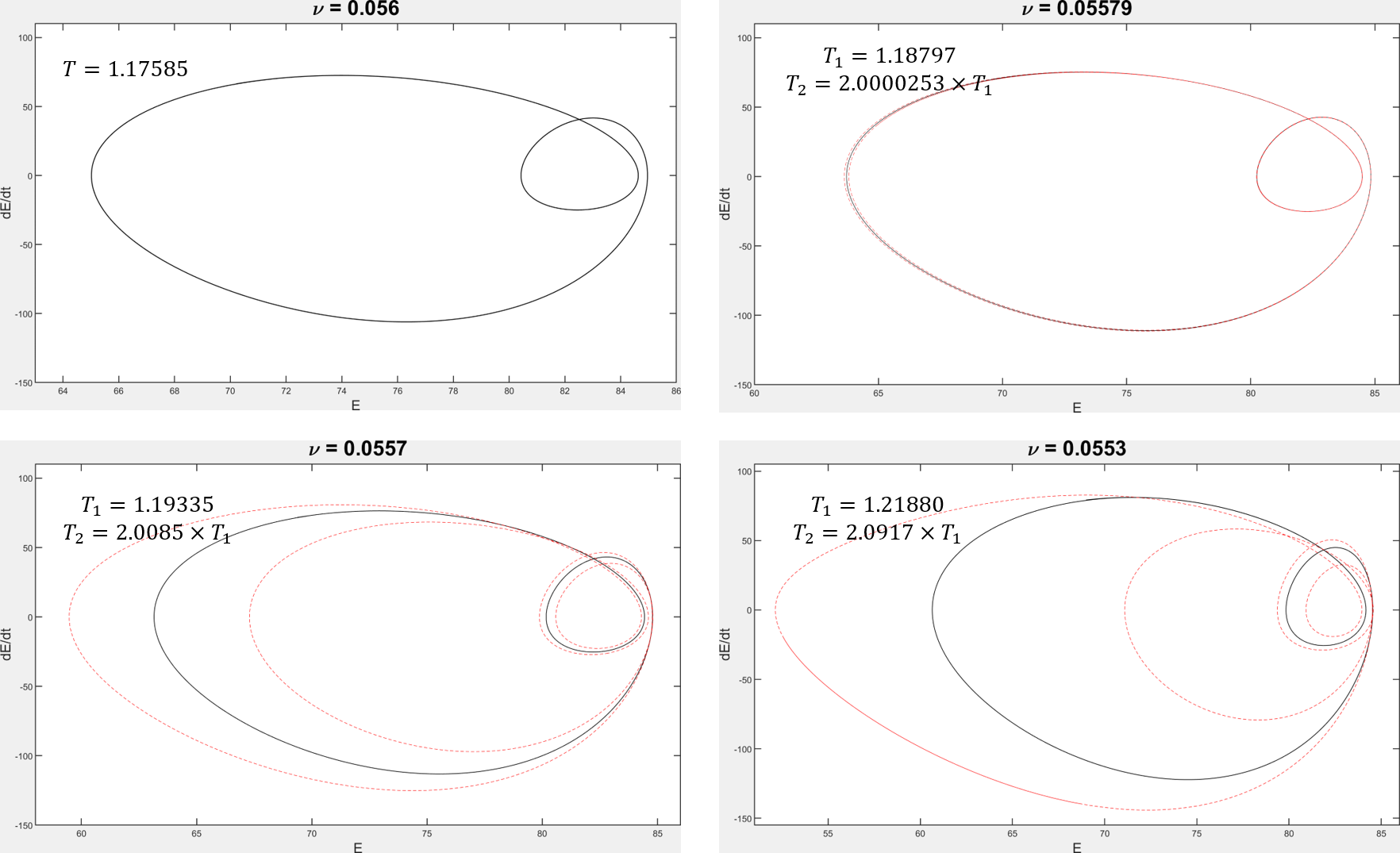 의 큰 값의 경우 는 정상(시간 독립) 해 또는 단순한 주기 궤도로 진화한다. 가 감소함에 따라 동역학은 결국 혼돈을 일으킨다. 질서에서 혼돈으로의 전이는 주기 배가 분기의 계단을 통해 발생하며,[5][6] 그중 하나가 그림에 나와 있다.