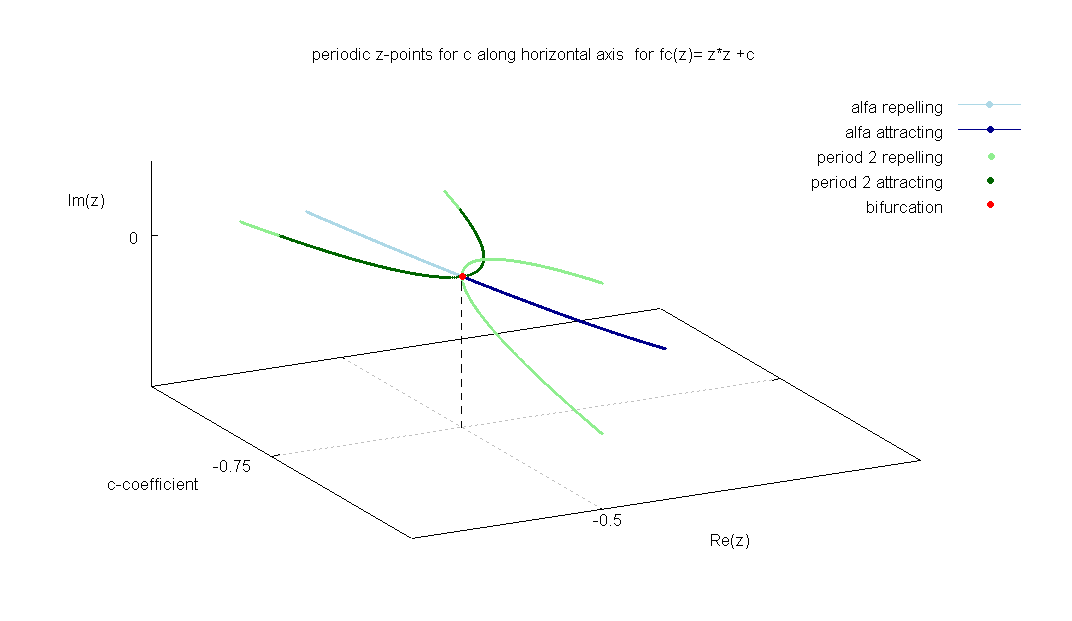 : 은 에서 안정적인 고정점(를 만족하는 1주기점)이지만, 에서는 불안정하다. 에서는 는 2주기점이 되고 안정적이다. 따라서 가 음수에서 양수로 증가하는 과정에서 0을 지나는 순간, 안정적인 고정점(1주기점)이 불안정해지고, 그 대신 안정적인 2주기점이 양쪽에 생겨난다.