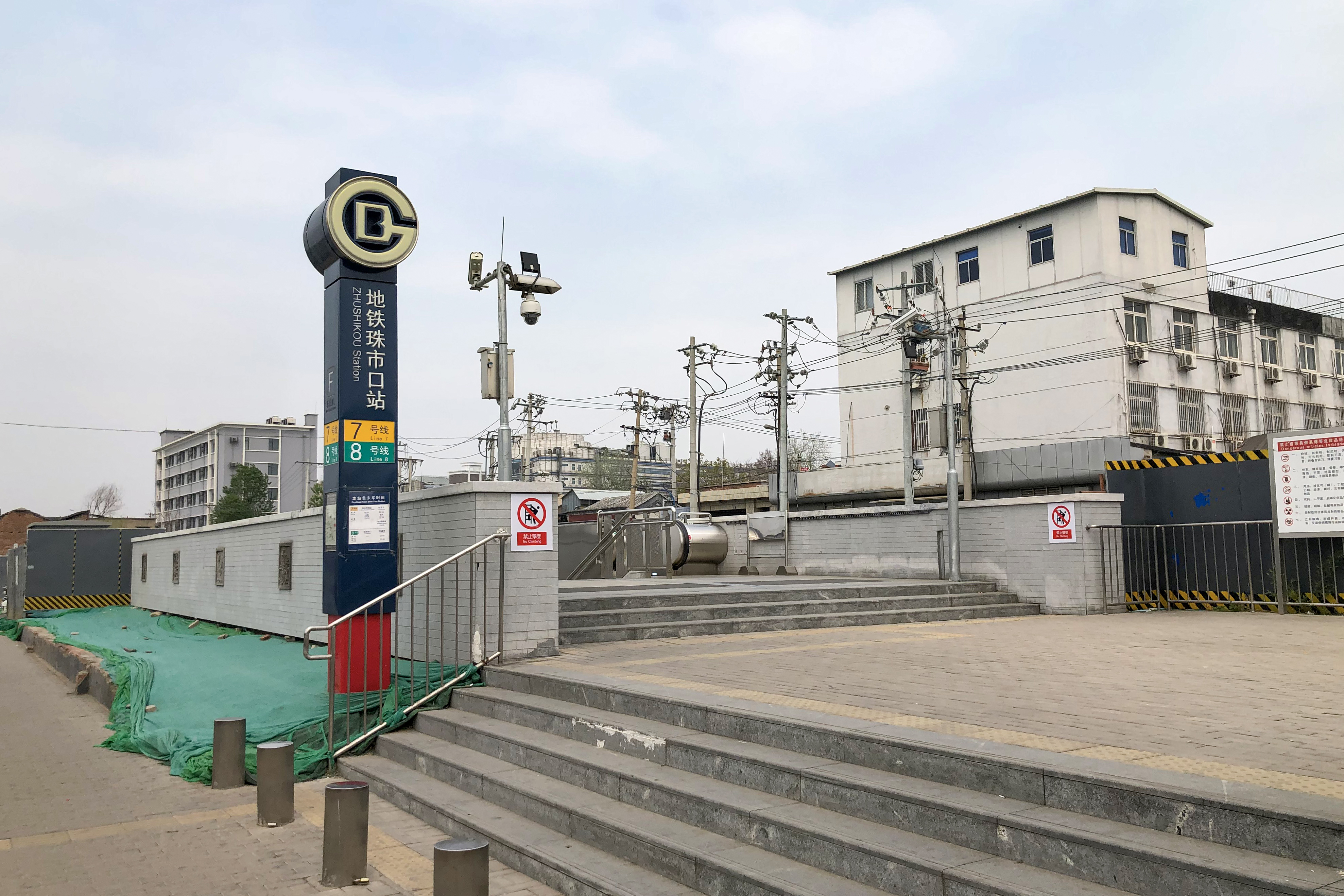 이 역은 전문대가 (남북 방향)와 주스커우동대가-주스커우시대가 (동서 방향)가 교차하는 교차로 바로 아래에 위치한다.[5] 7호선은 동서 방향으로, 8호선은 남북 방향으로 뻗어 있다.
