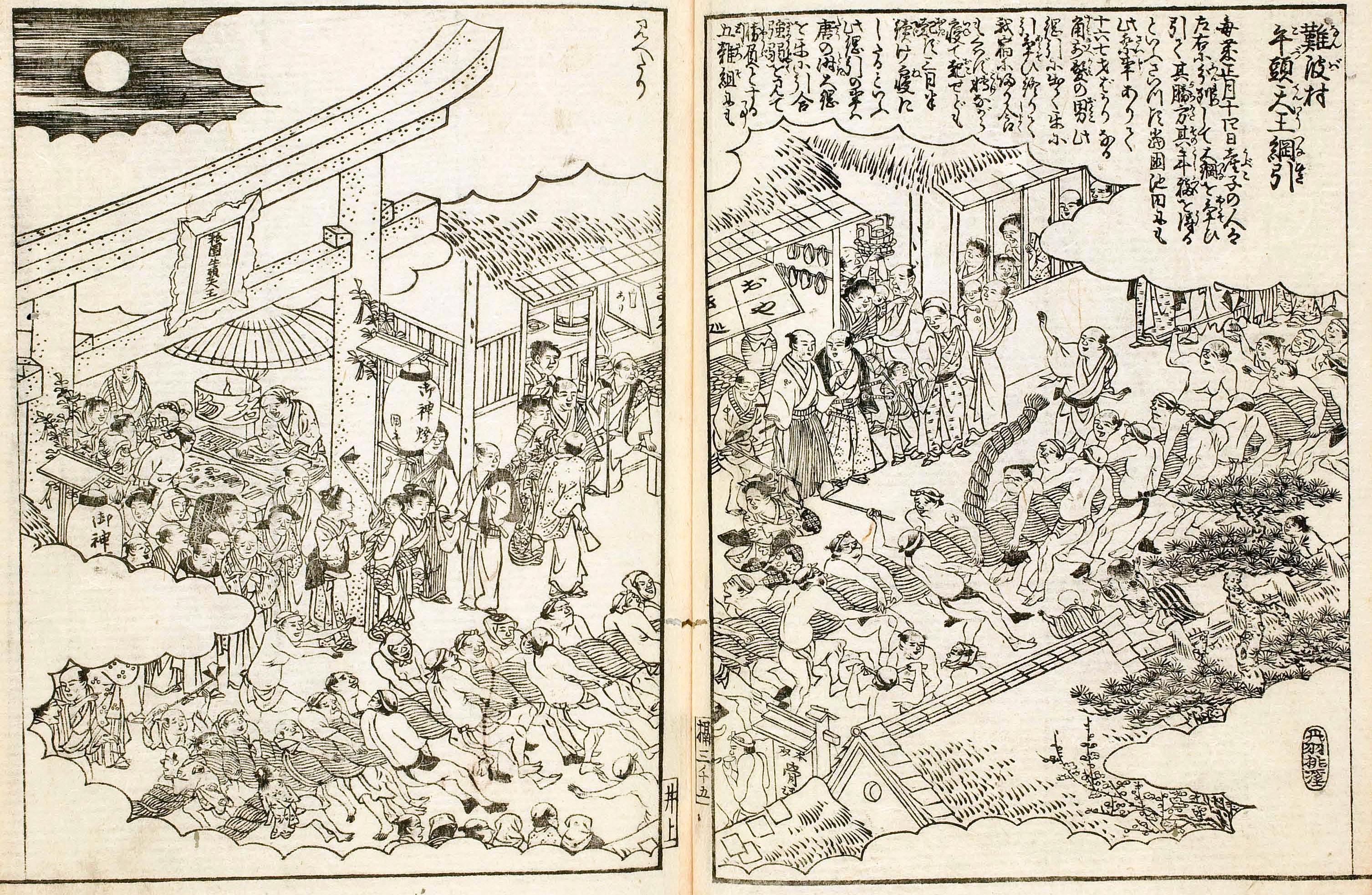 『호쿠사이 만화』 8편 “무례강”(19세기)에는 네발로 기어 다니며 등에 밧줄을 걸고 잡아당기는 형태(등 끌기)나 손가락에 밧줄을 묶은 상태로 잡아당기는 손가락 끌기가 보인다.