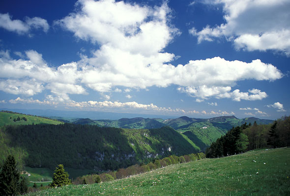스위스-프랑스 국경을 따라 주라 산맥이 이어진다. 이 산맥은 최고 높이 1718m까지 뻗어 있으며, 스위스 고원에 의해 서부 알프스와 분리되어 있다. 알프스 산기슭에 위치하지만, 주라 산맥은 일반적으로 알프스와는 별개의 ''Mittelgebirge'' 산맥으로 간주된다.