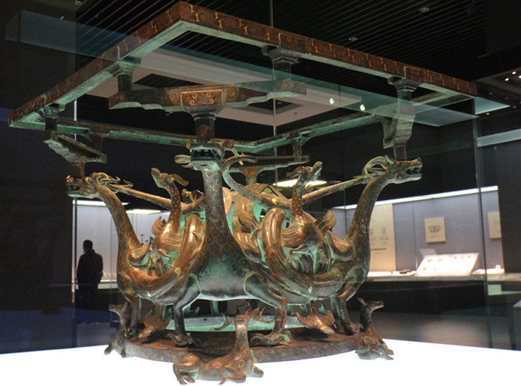 전국 시대에 제작된 용과 봉황으로 장식된 청동 사각 탁자.
