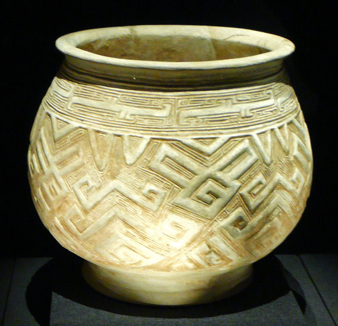 중국 초기 예술 형태는 기원전 6000년까지 거슬러 올라가는 신석기 시대의 양사오 문화에서 발견된다. 반포와 같은 고고학적 발견을 통해 양사오 문화가 토기를 제작했음이 밝혀졌는데, 초기 도자 공예는 무늬가 없거나 끈 자국이 있는 경우가 많았다. 최초의 장식은 물고기와 사람의 얼굴이었지만, 결국 대칭적인 기하학적 추상 디자인으로 발전했으며, 일부는 채색되었다.[82]