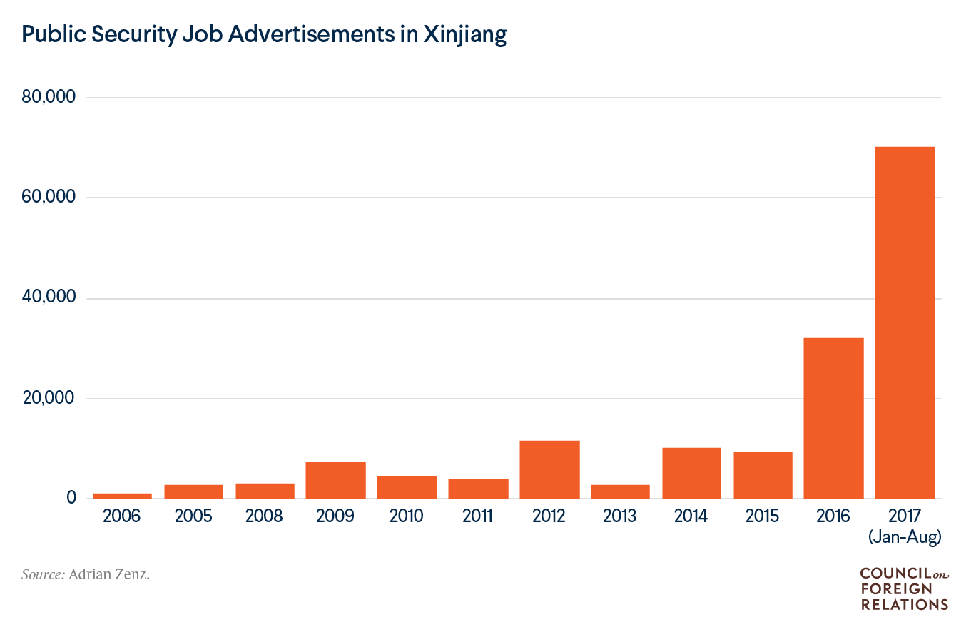 베이징의 지시에 따라 신장 공산당 지도부는 '인민 전쟁'을 시작하고 20만 명의 당 간부를 신장에 파견했다. 시진핑은 초기 결과에 불만을 품고 2016년 장춘셴을 천취안궈로 교체했다. 천취안궈는 수만 명의 경찰을 추가 모집하고 사회를 신뢰, 보통, 불신으로 나누는 것을 감독했다.[52]