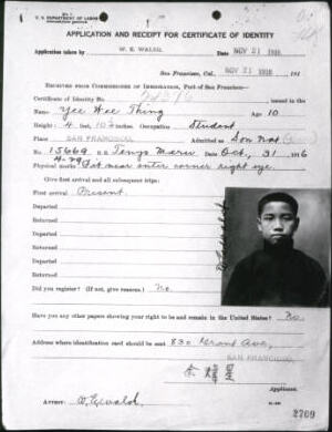 1916년 11월 21일, 이위싱에게 발급된 미국 시민의 아들임을 증명하는 신분증명서. 중국에서 이민 온 사람들에게 필수였다.