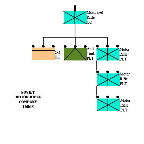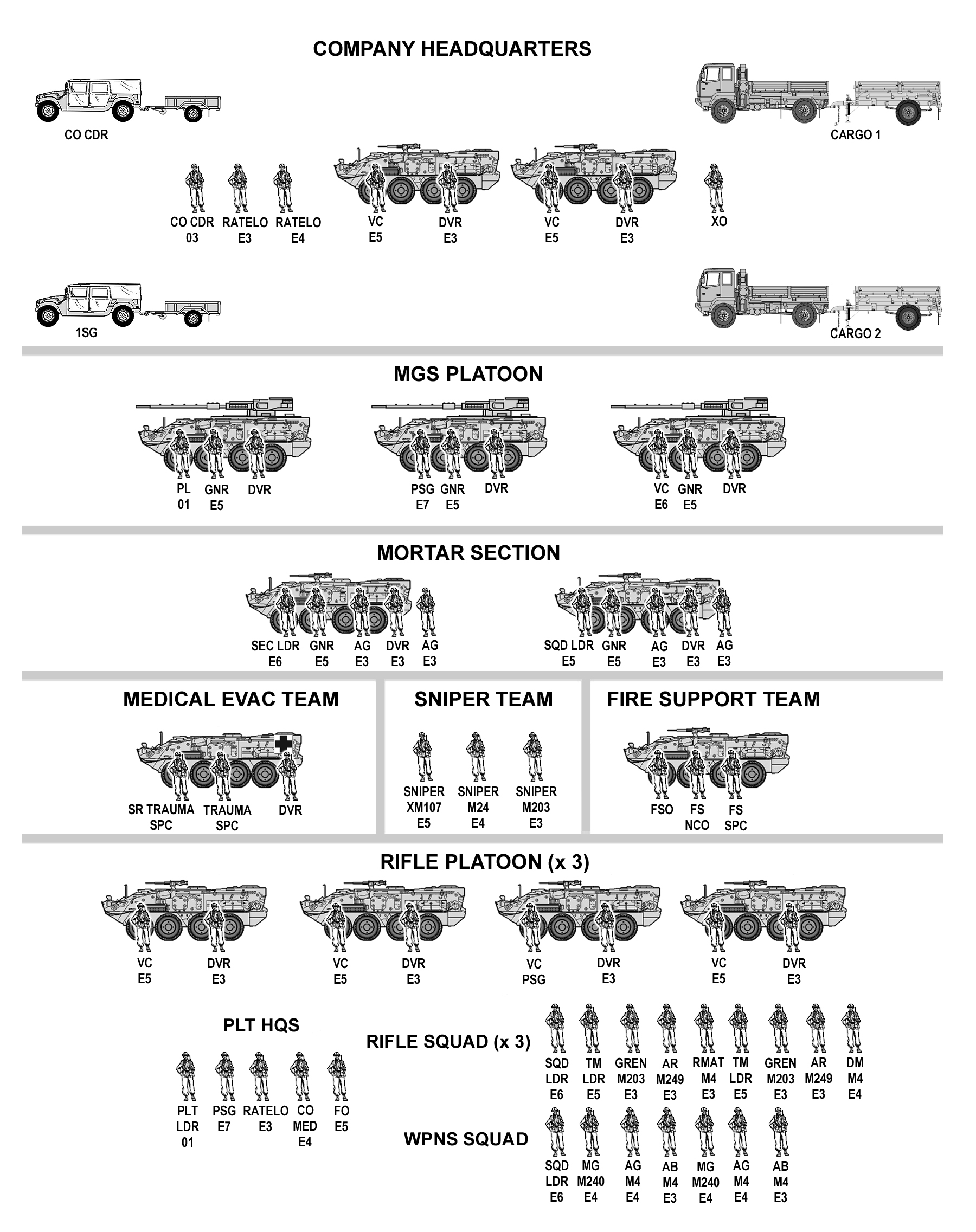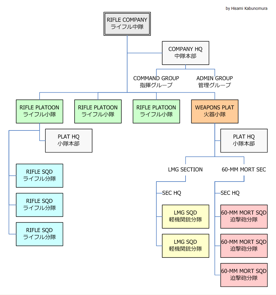 일반적인 구성 | 본부 소대 2개에서 4개의 소총 소대 (보병 중대의 경우) 기타 지원 소대 또는 분대 |