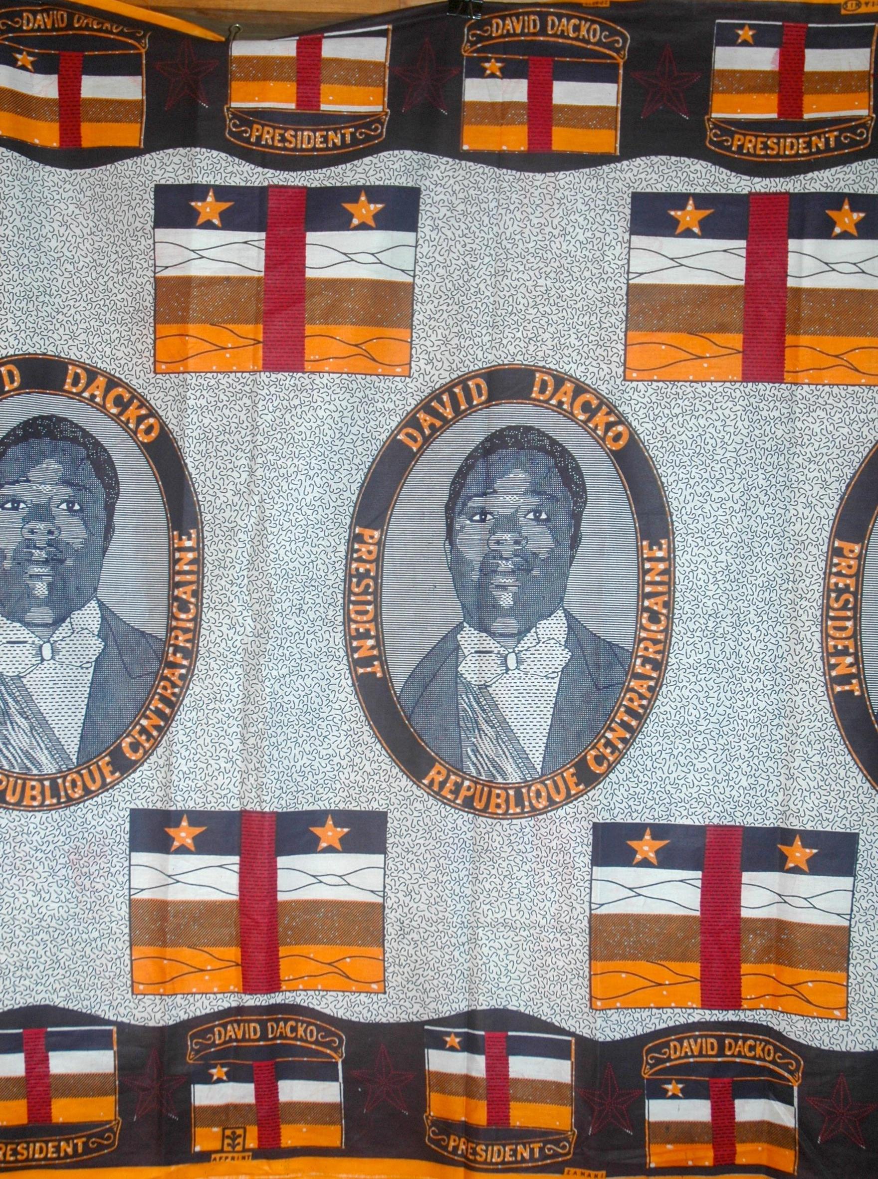 다비드 다코 대통령과 중앙아프리카 공화국 국기가 그려진 카펫; 국기에는 별이 하나가 아닌 두 개로 잘못 묘사되어 있다.
