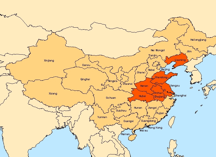 - 안후이성, 허난성, 산둥성, 장쑤성, 후베이성, 헤이룽장성, 내몽골 자치구, 신장 위구르 자치구, 톈진 시, 하이난성, 쓰촨성, 윈난성의 12개 1급 행정 구역으로 퍼져 있다.