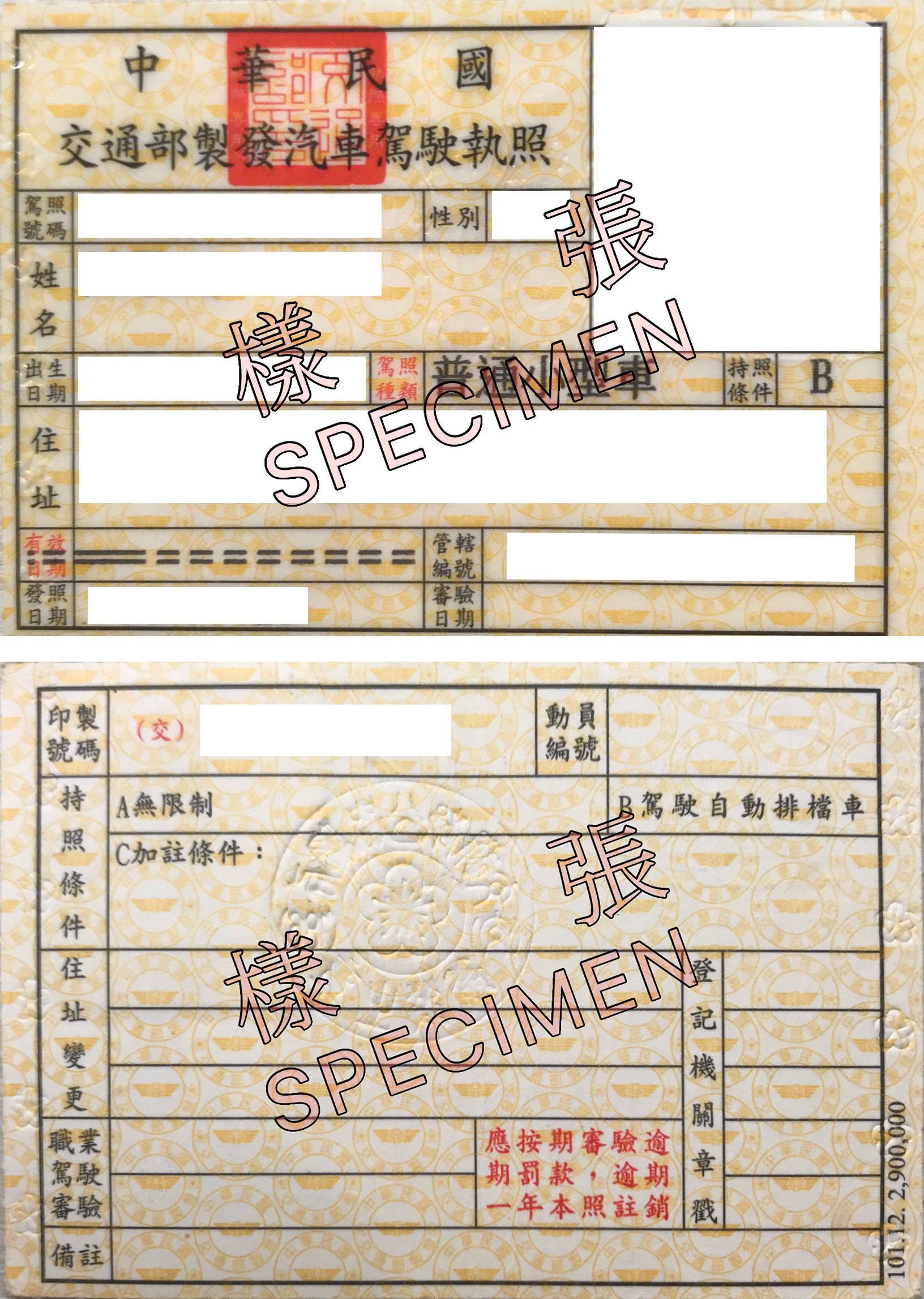 2010년 7월부터 중화민국의 자동차 운전면허증 앞면은 다음과 같은 형식을 갖추고 있다.[7]