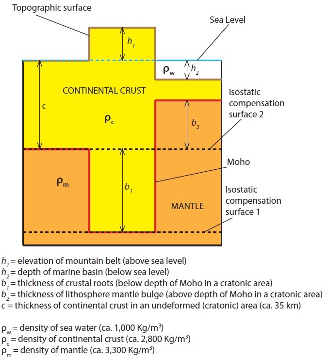 여기서 은 맨틀의 밀도(약 3300kg/m3)이고, 는 지각의 밀도(약 2750kg/m3)이다. 따라서 일반적으로: