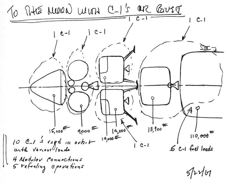 1961년 지구 궤도에서 아폴로 달 착륙 임무를 조립하는 데 필요한 10번의 C-1 발사를 보여주는 스케치
