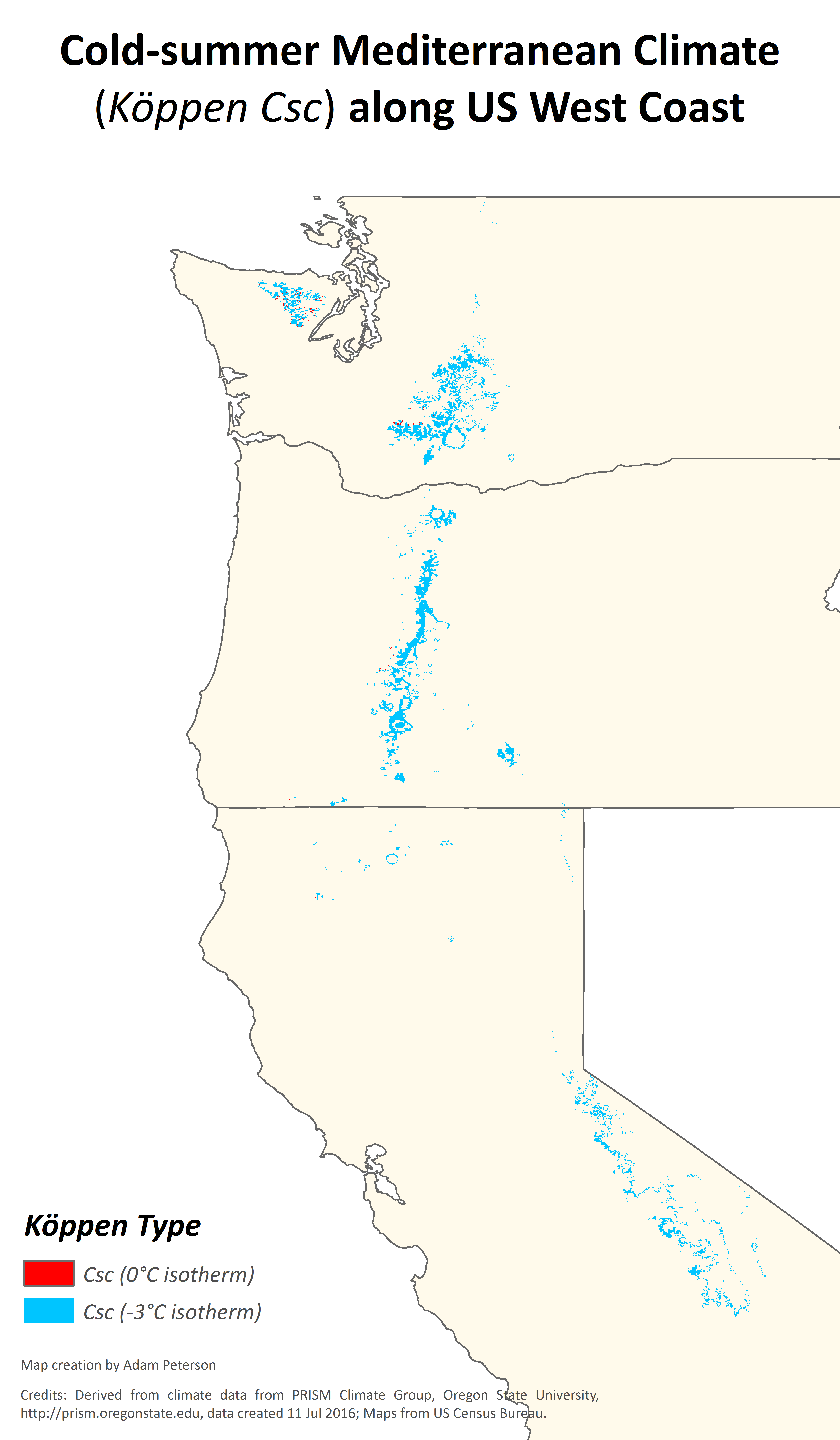 북아메리카에서는 워싱턴주, 오리건주, 캘리포니아주의 올림픽 산맥, 캐스케이드 산맥, 클라마스 산맥, 시에라네바다 산맥에서 Csc 기후 지역을 찾을 수 있다. 이러한 지역은 온난한 여름 지중해성 기후(Csb) 또는 더운 여름 지중해성 기후(Csa)를 특징으로 하는 저지대 지역 근처의 고지대에 위치한다. 하와이의 할레아칼라 정상에서도 이 기후의 드문 사례가 나타난다.