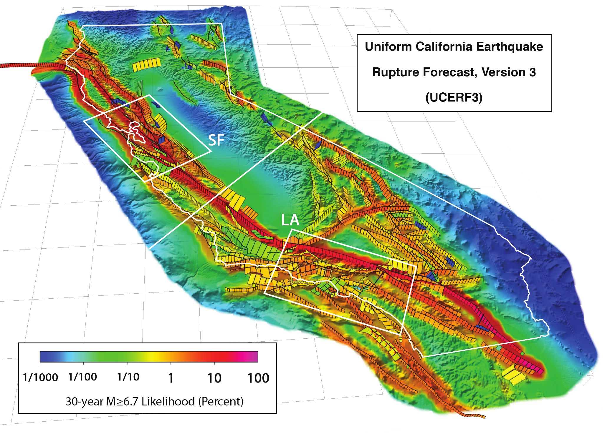 통일 캘리포니아 지진 파열 예측, 버전 3(UCERF3)는 2015년 캘리포니아주에 대해 발표된 최신 공식 지진 파열 예측(ERF)으로, UCERF2를 대체한다. UCERF3는 장기 및 단기적으로 잠재적 피해를 줄 수 있는 지진 파열의 가능성과 심각성에 대한 권위 있는 추정치를 제공한다. 지반 운동 모델과 결합하면 주어진 기간 동안 예상되는 지반 진동의 심각성(지진 위험)과 구축 환경에 대한 위협(지진 위험)에 대한 추정치가 생성된다. 이 정보는 엔지니어링 설계 및 건축 법규, 재해 계획, 지진 보험료가 예상 손실에 충분한지 평가하는 데 사용된다.[19] UCERF3를 통해 다양한 위험 지표[20]를 계산할 수 있다. 일반적인 지표는 2014년부터 30년(일반적인 모기지 수명) 동안 [21] M 6.7 지진(1994년 노스리지 지진 규모)이 발생할 가능성이다.