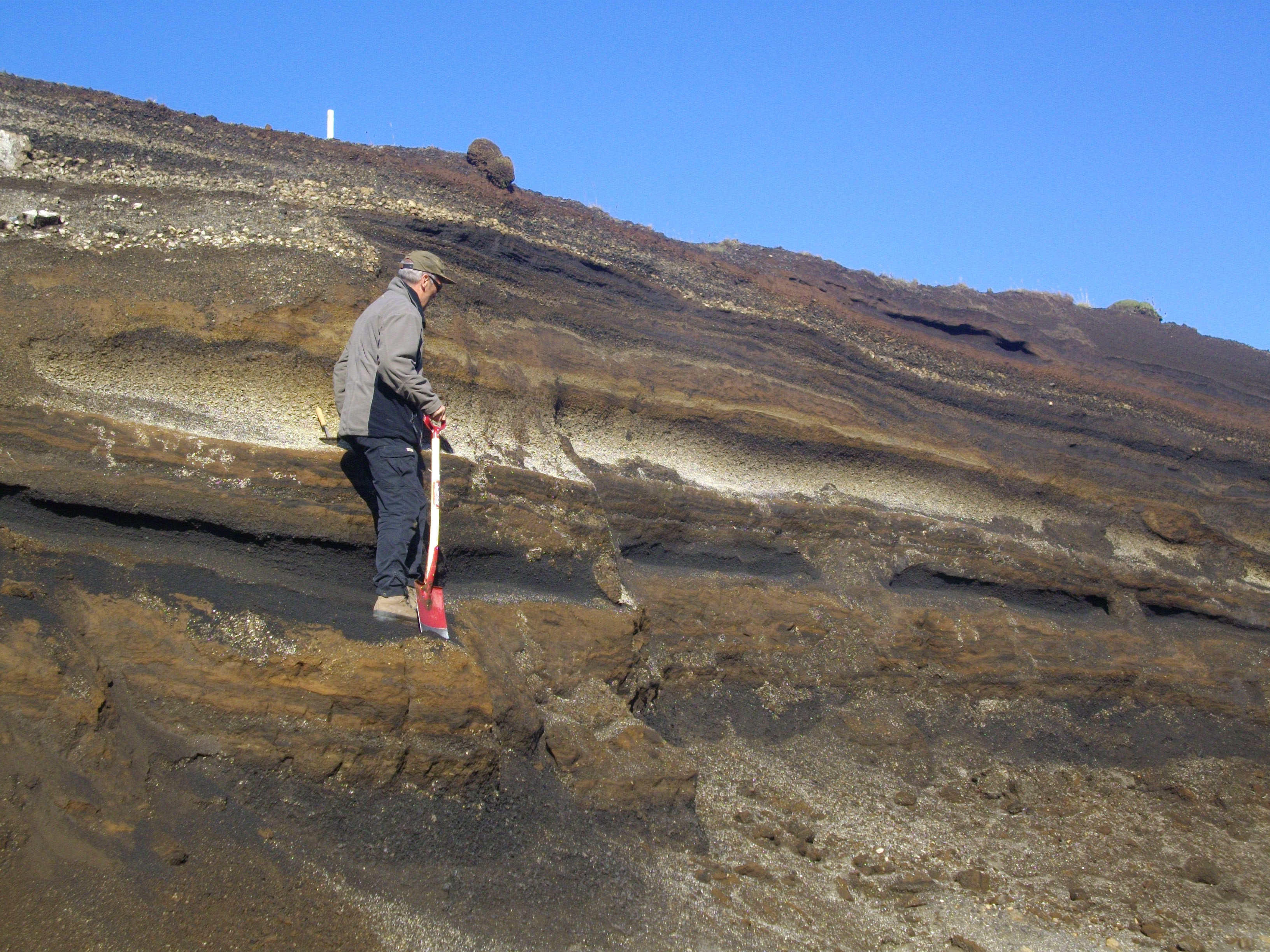 아이슬란드 남중부의 테프라층. 화산학자의 손 높이에 있는 밝은색에서 어두운색으로의 층은 헤클라산에서 분출된 테프라유문암부터 현무암까지의 지준층을 이룬다.
