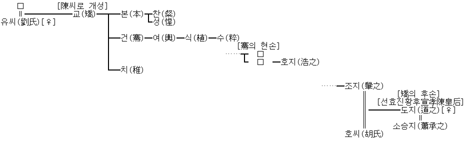 장남 진본은 조방과 조모 시대에 정치에 참여하여, 통솔력과 행정 수완이 뛰어났기 때문에 진북장군·가절·도독 하북 제군사에까지 승진했다.[1] 차남 진건은 사마소·사마염 부자에게 협력하여, 진의 성립과 발전에 협력한 인물이며, 『진서』에 입전되어 있다.[1] 진교전에 인용된 『세어』에서도 기략이 풍부한 발언이 실려 있다.[1] 진교의 자손은 서진·동진을 거쳐 귀족으로 이어졌다.[1]