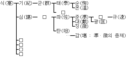 진기(원방)와 진심(계방) 형제의 아들인 진군과 진충이 각각 아버지의 공적과 덕행을 논했으나 우열을 가릴 수 없었다. 그래서 할아버지인 진식에게 의견을 구하자, 진식은 "원방만한 형은 없고, 계방만한 아우도 없다"라고 말했다. 이는 『세설신어』에 수록된 일화이다.4. 후손