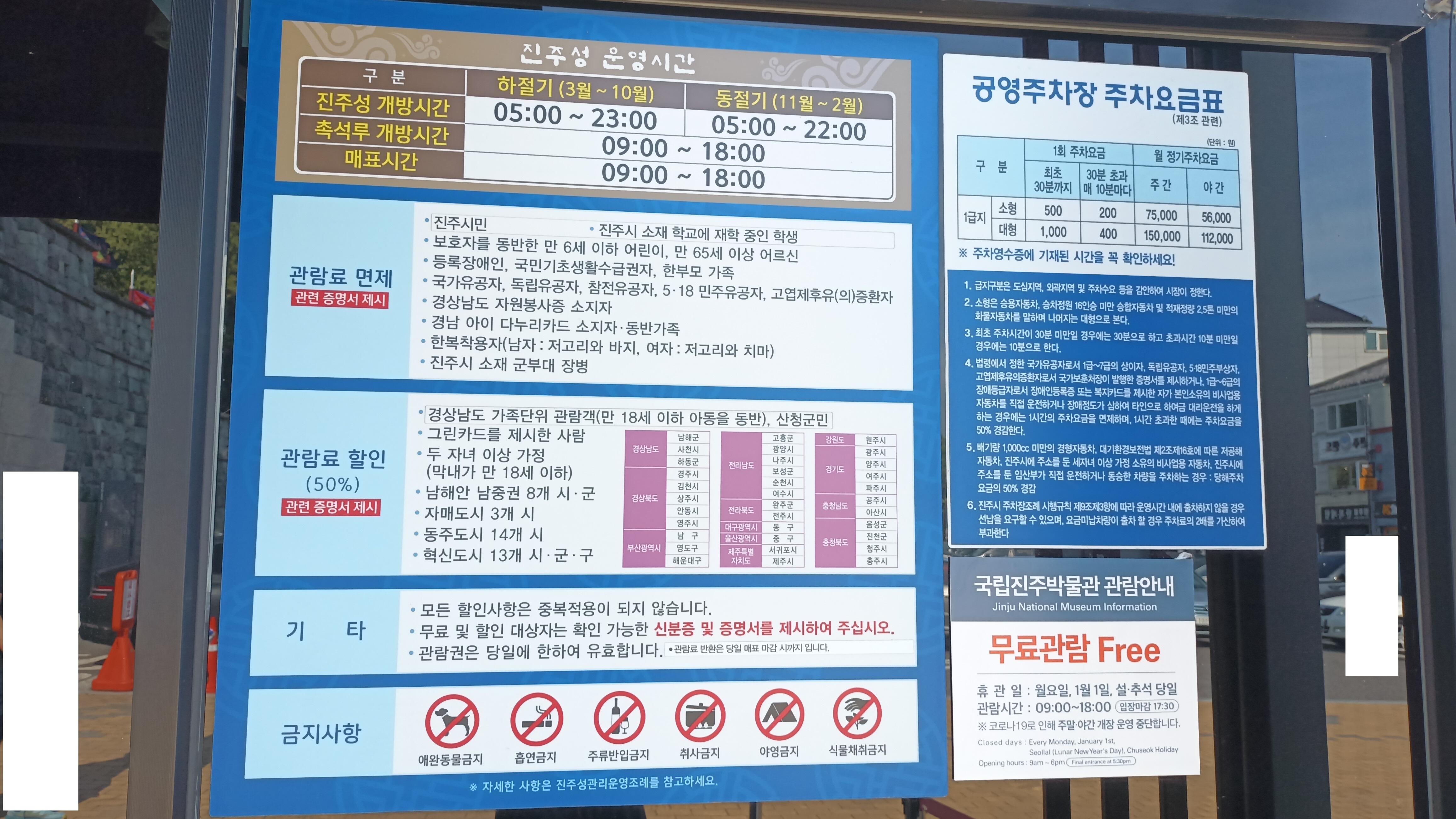 진주시민과 만 6세 이하 어린이, 65세 이상 노인, 국가유공자, 한복 착용자 등은 진주성 관람료가 무료이며, 산청군민, 2자녀 이상 가정, 사진에 제시된 시, 군, 구 지역 주민들은 관람료가 50% 할인된다. 할인은 중복되지 않으며, 무료 및 할인 대상자는 관련 신분증이나 증명서를 제시해야 한다.