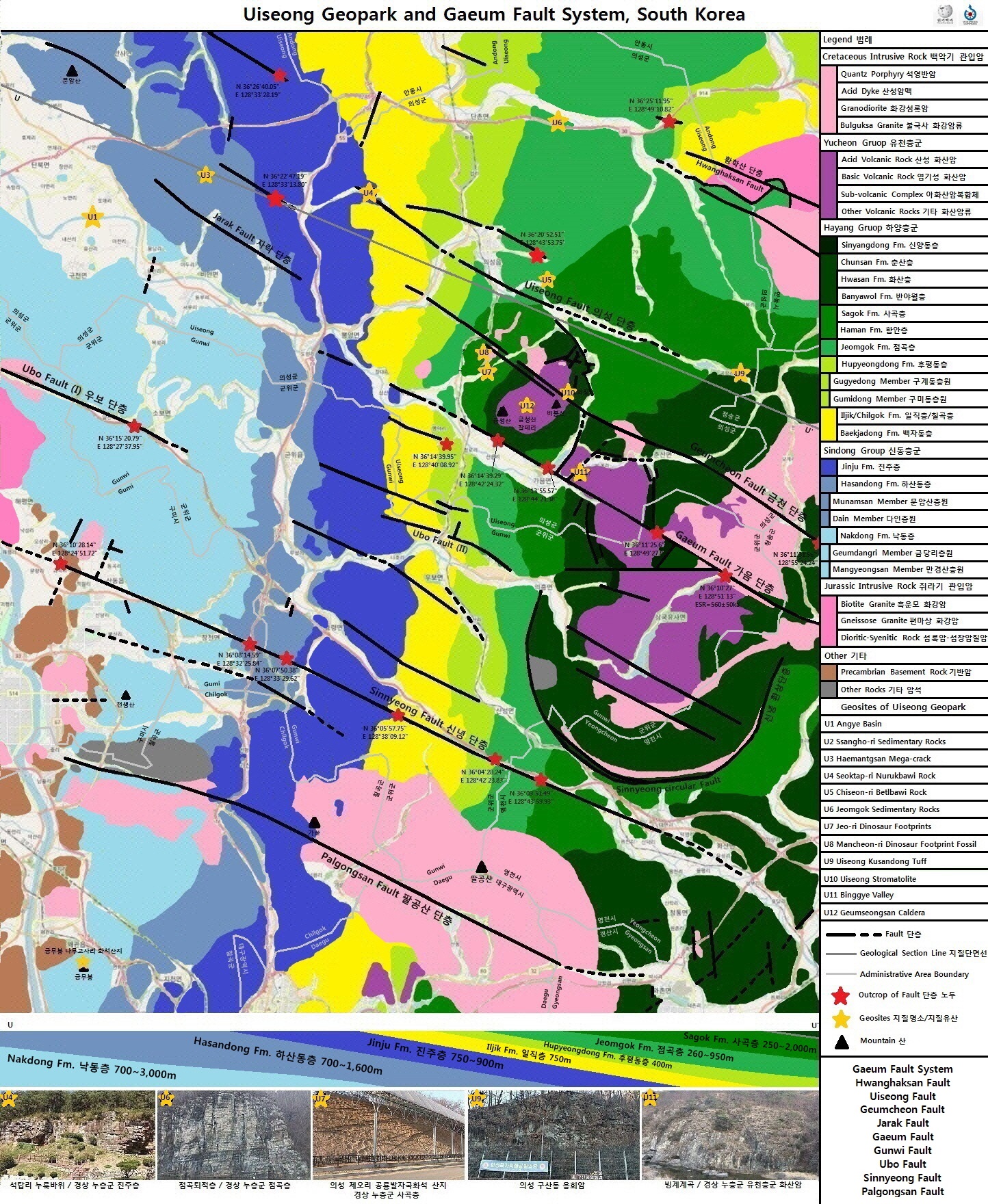 - 사천시 축동면에 위치한 절개사면은 북서 방향으로 약 130m의 연장을 가지며, 사면의 하부에는 셰일층이 분포하는 반면, 상부에는 중립질사암층이 분포한다. 또한 셰일층에 집중되어 발달하는 단층들은 북동과 동-서 방향의 주향이 우세하며 단면에서 1m 이내의 수직변위를 가지는 정단층의 기하를 보인다. 이 단층들은 상부의 사암을 절단하지 못한다.[69]