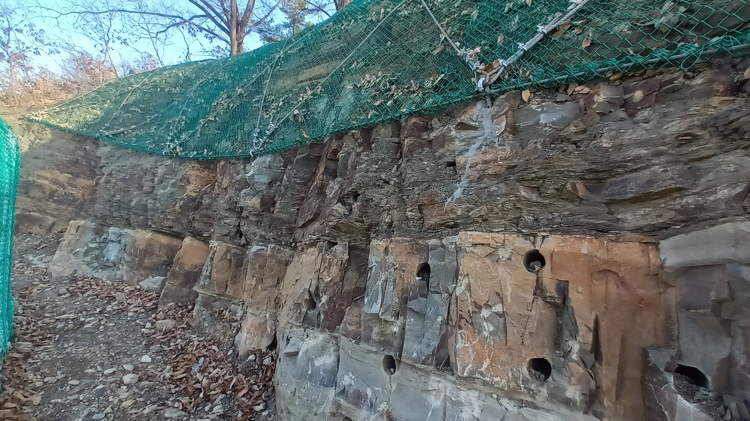 대구광역시 달성군 하빈면 현내리 산 24-3~24-6 지역(하빈면 하빈로82길 13 진주식당 앞)에서 하빈리82길 도로 공사로 진주층의 좋은 노두가 드러났다.