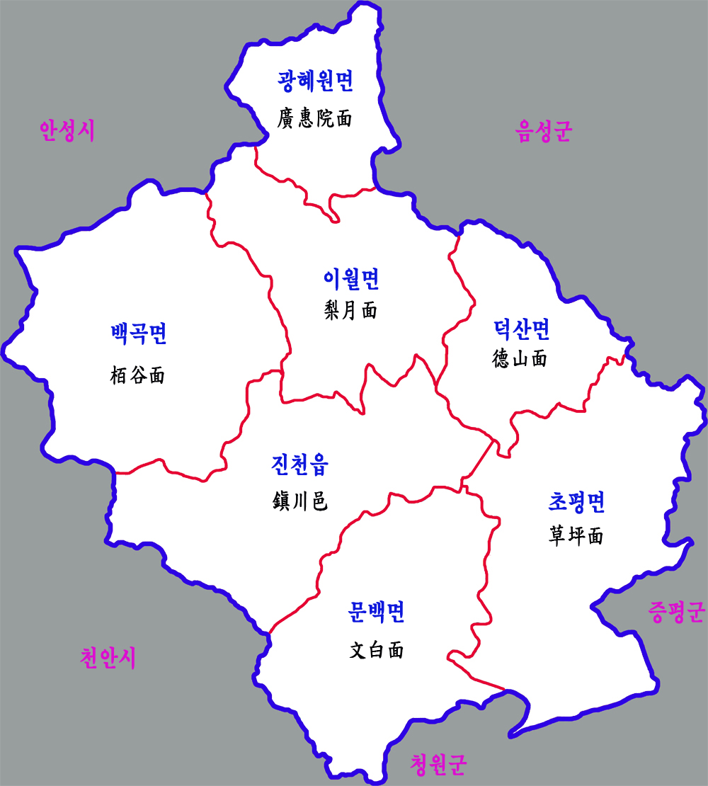 - 1896년 8월 4일 충청북도 진천군으로 개편하였다.[11]