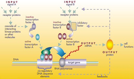 ''1'': RNA 중합효소, ''2'': 억제자, ''3'': 프로모터, ''4'': 오퍼레이터, ''5'': 젖당, ''6–8'': 단백질 암호 유전자, 스위치에 의해 제어되며 젖당을 분해함]]1961년, 자크 모노, 장피에르 상죄와 프랑수아 자코브는 세균 ''대장균''에서 lac 오페론을 발견했다. lac 오페론은 피드백 제어 루프로 배열된 유전자 집합체였으며, 환경 자극에 의해 "켜질" 때만 생성물이 만들어지도록 했다. 이 생성물 중 하나는 설탕을 분해하는 효소인 젖당이었고, 젖당 자체가 유전자를 켜는 자극이었다. 이것은 세균과 같이 작은 유기체에서도 유전자가 정밀한 제어를 받는다는 것을 처음으로 보여준 획기적인 발견이었다. 이는 다른 많은 유전자들도 정교하게 조절될 수 있다는 것을 암시했다.[25]