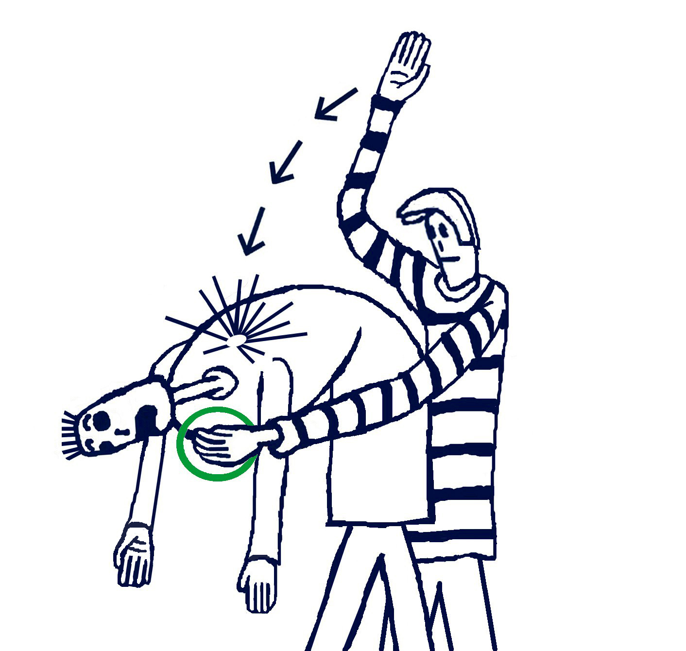 등 두드리기:"'''등을 찰싹 때리기'''" : 효과를 높이기 위해 때리지 않는 손으로 피해자의 가슴을 받쳐준다. 피해자의 몸을 최대한 구부린 다음 다른 손으로 세게 때린다. 환자의 등을 손바닥으로 세게 5회 두드린다. 효과를 높이려면, 때리지 않는 손으로 환자의 가슴을 받쳐주고, 환자의 몸을 최대한 앞으로 숙이게 한 후 다른 손으로 세게 때린다.