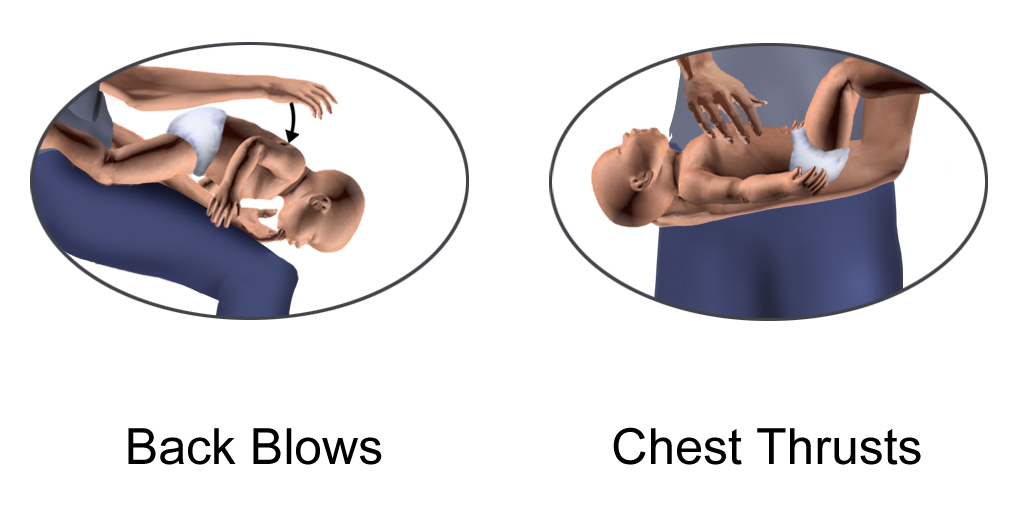 각각의 응급처치를 5회씩 번갈아 가며 반복하고, 질식이 계속되면 응급 의료 서비스에 전화한다.[29] 임산부나 비만 환자의 경우, 복부 밀어내기 대신 가슴 압박을 시행한다.[29]"'''흉부''' 압박" 의 질식 방지 기술 : 압박을 가슴뼈 아래쪽 절반에 강력하게 가한다. 가슴뼈 아래쪽 절반에 강하게 압박을 가한다. 1세 미만 영아의 경우, 다음과 같은 방법으로 응급처치를 시행한다.[30]'''왼쪽:''' "등을 찰싹 때리기", 아기가 약간 거꾸로 기울어져 있다, 조심스럽게 개최, 그리고 얼굴 주위에 한 손으로. '''오른쪽''': "흉부 압박", 두 손가락으로 가슴 중앙의 아래쪽 절반을 누른다.