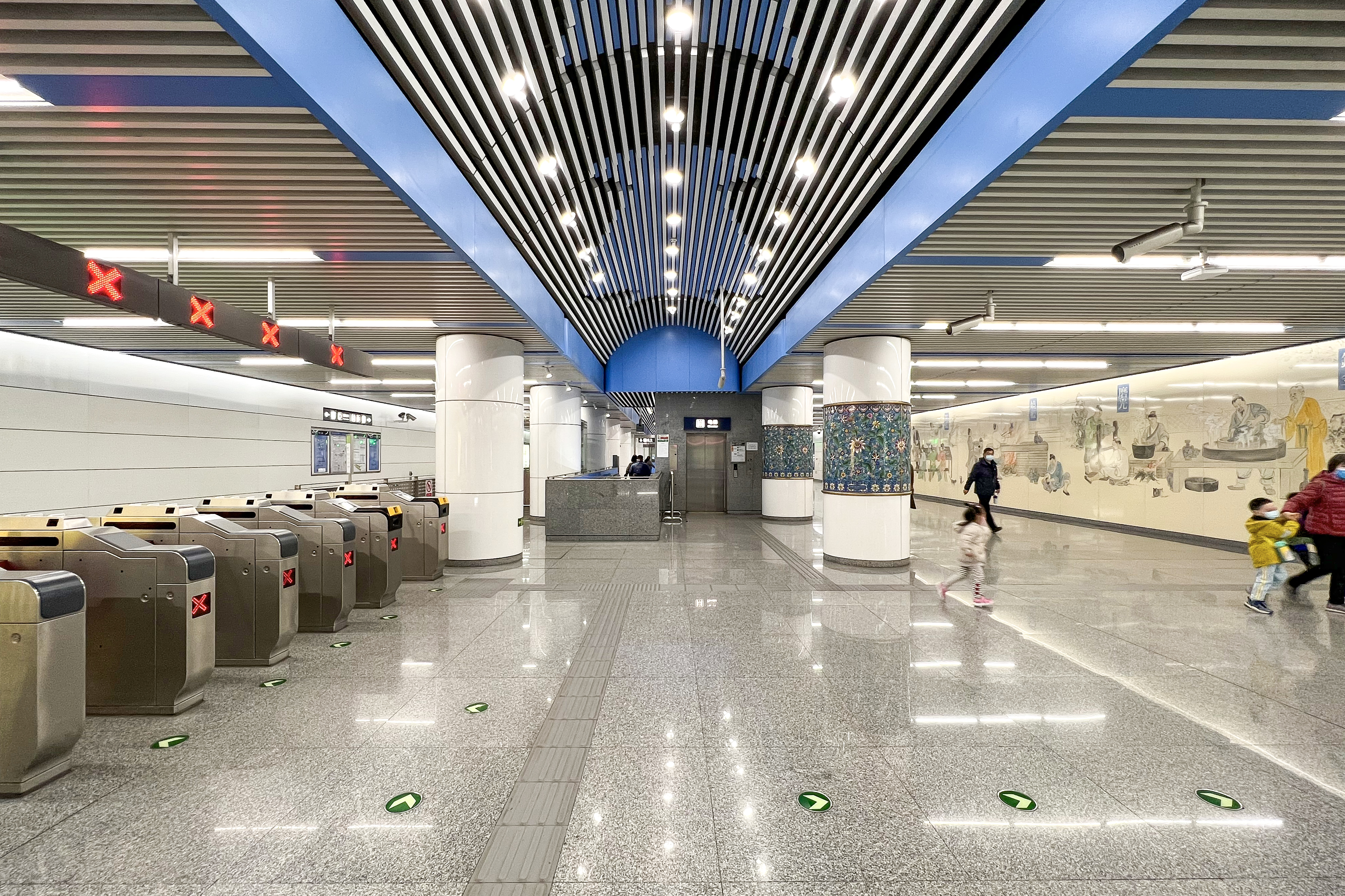 당초 오픈 컷 공법으로 건설할 계획이었으나 토지 확보의 어려움으로 커버 컷 공법으로 변경되었다. 역사 길이를 단축하기 위해 지하 2층, 지하 4경간 구조로 변경하였으며, 이는 PBA 지하 굴착 공법을 사용한 중국 최초의 4아치 PBA 건설이다.[7] 역 서쪽 끝에는 건넘선이 있다.[8]