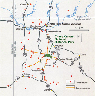 차코 협곡에서 직선적으로 북상하면 서먼 유적이나 아즈텍 유적에서 볼 수 있는 집락이 있다. 그러한 집락은 1100년경부터 시작하는 습윤기 30년 동안 세워졌다. 차코 협곡에서 100km 남쪽에는 주요 교역로인 그레이트 사우스 로드를 따라 다른 집락군이 위치해 있다. 그 중 가장 큰 것은 킨 니조니이며, 습지대와 같은 곳 안에 있는 해발 2100m의 메사 꼭대기에 세워졌다.