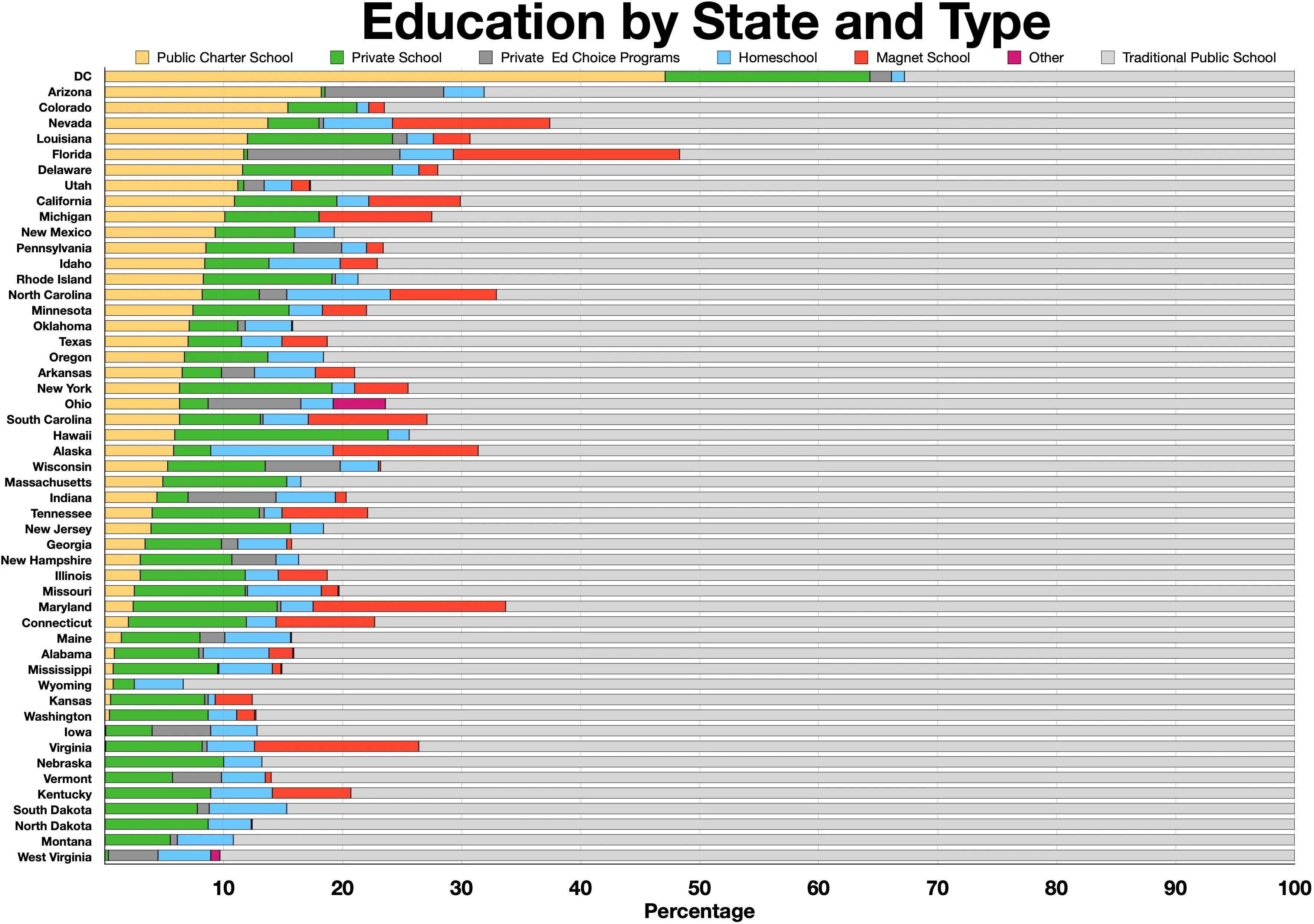 2021년 12월 기준으로, 미국 전역에는 약 8,000개의 차터 스쿨에 370만 명의 학생이 재학 중이며, 이는 전체 공립 학교 학생의 7.4%에 해당한다.[42] 2002년 낙오 아동 방지법(No Child Left Behind Act)은 차터 스쿨을 주요 구성 요소로 지정했다.[51]