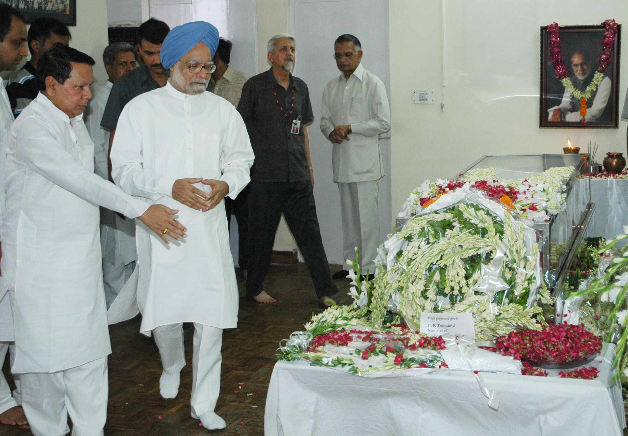 2007년 7월 9일 델리에서 장례식에 참석하여 찬드라 셰카르의 시신에 경의를 표하는 만모한 싱 총리