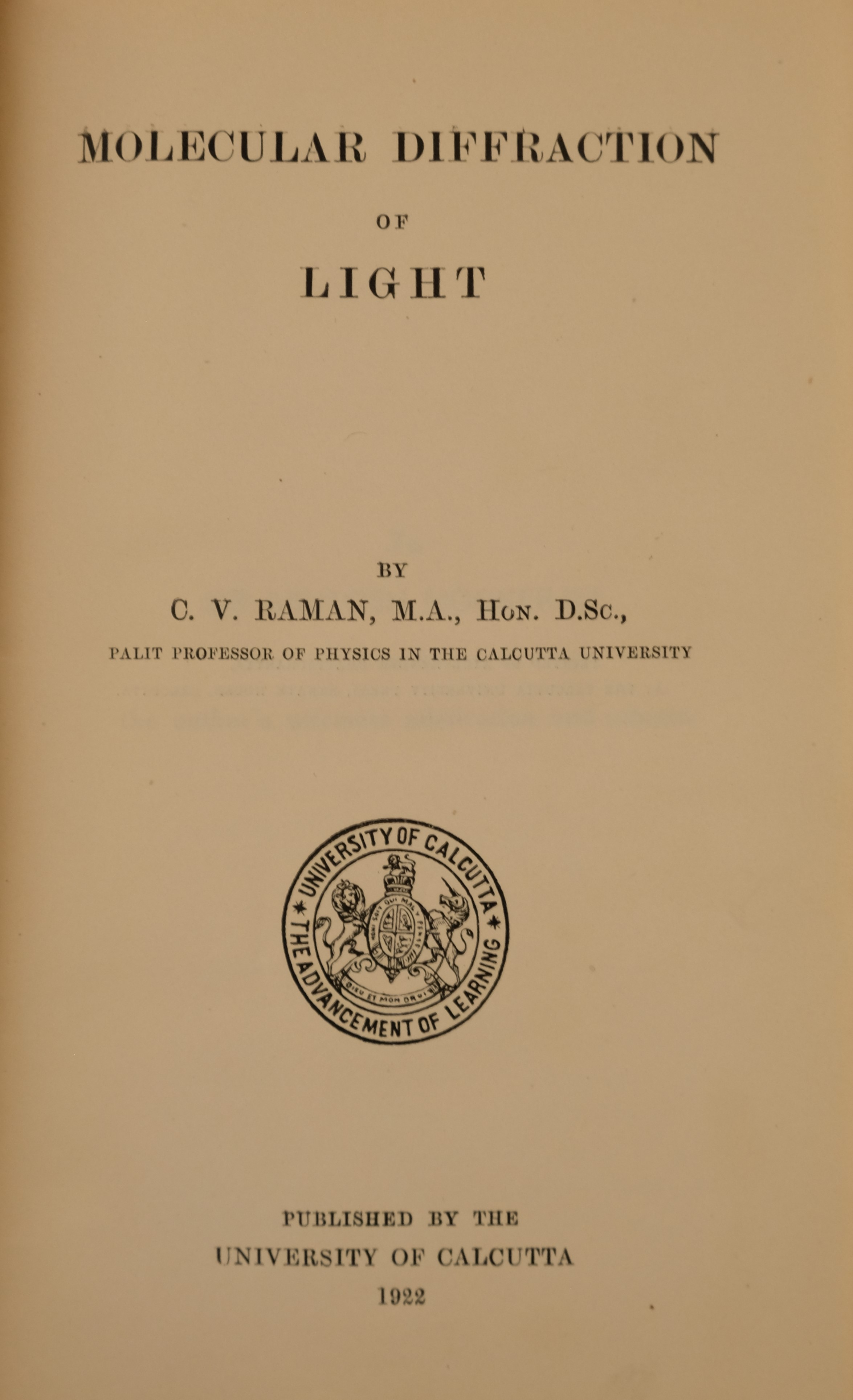 찬드라세카라 벵카타 라만은 1907년 인도 재무 서비스 시험에 합격하여 콜카타에서 공무원 생활을 시작했다. 그는 인도 과학 진흥 협회(IACS)에서 연구 활동을 병행했으며, 1917년 캘커타 대학교의 팔리트 물리학 교수로 임명되었다. 1926년 인도 물리학 저널을 창간하였고 해당 저널을 통하여 라만 효과를 발표, 노벨 물리학상을 수상하는 큰 업적을 이루었다.1932년 팔리트 교수직을 데벤드라 모한 보세에게 넘겨주고, 1933년 방갈로르에 있는 인도 과학 연구소(IISc)의 소장으로 임명되었다.[38] IISc에서 재임하는 동안 X선 결정학자 G. N. 라마찬드란을 채용했다. 1934년 인도 과학 아카데미를 설립하고 아카데미 저널인 ''인도 과학 아카데미 회보''(나중에 ''회보 - 수학 과학'', ''화학 과학 저널'', ''지구 시스템 과학 저널'')를 발행하기 시작했다.[34] 1917년 초에 시작하였던 콜카타 물리학회가 그 무렵 설립되었다.[19]
