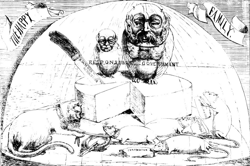 책임정부제를 비판하는 만화. 케이프 지도자들을 올빼미로 묘사하여 여러 파벌 간의 권력과 지위가 나뉘어 있는 모습을 보여준다. 존 찰스 몰테노(오른쪽)와 솔로몬 솔로몬