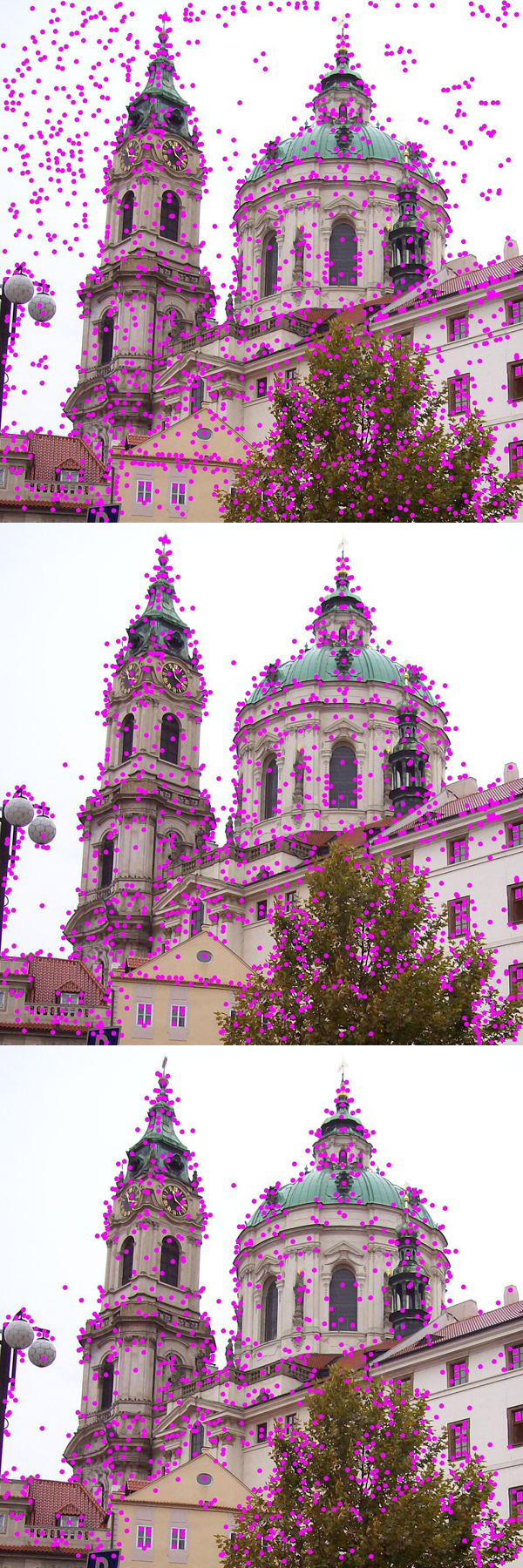 스케일 공간 극대점을 감지한 후(가장 위에 있는 이미지에 위치가 표시됨) SIFT 알고리즘은 저대비 키포인트를 버리고(나머지 점들은 중간 이미지에 표시됨) 가장자리에 위치한 키포인트를 필터링합니다. 결과 키포인트 집합은 마지막 이미지에 표시됩니다.