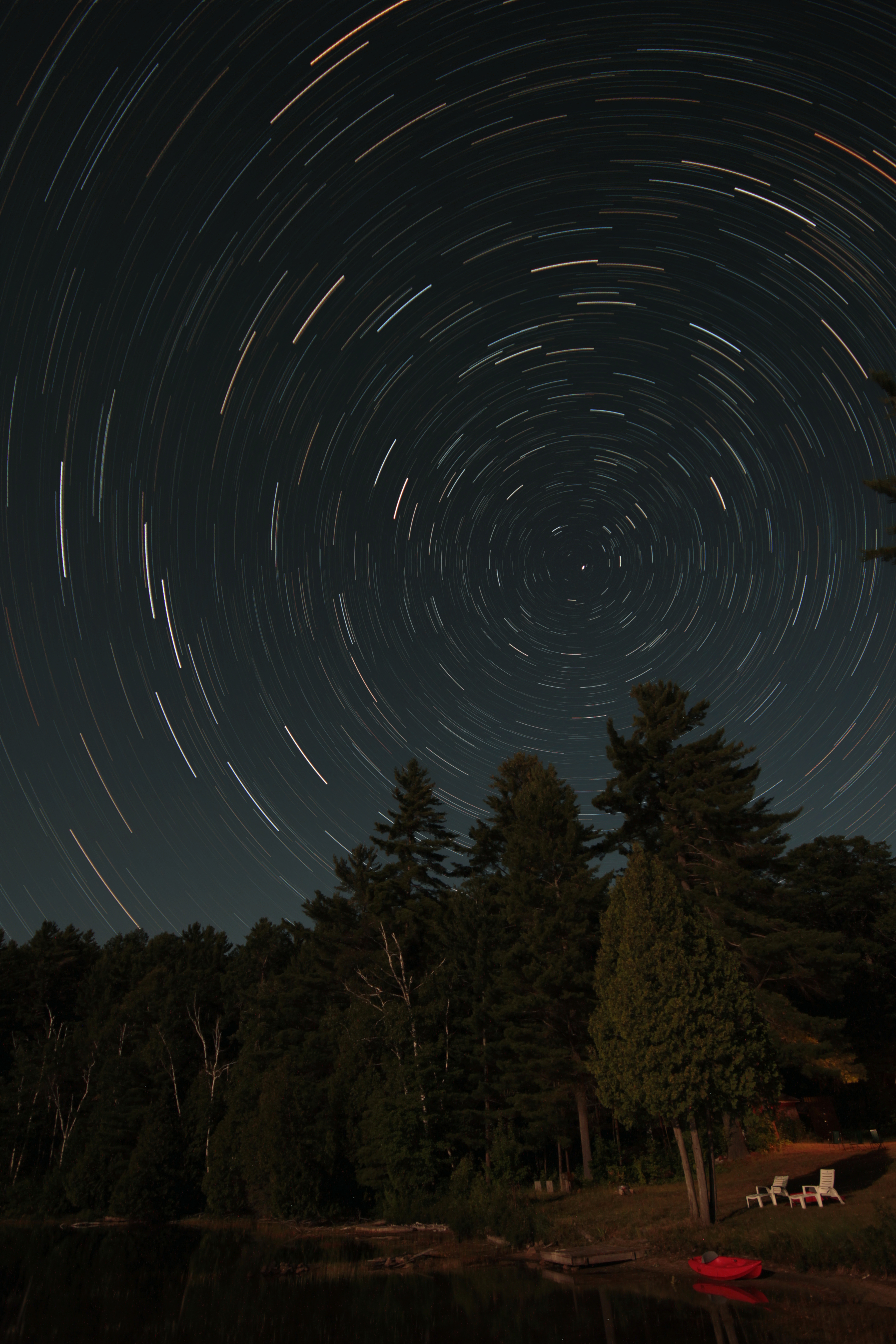 북반구에서 저녁 시간 동안 천구 북극을 중심으로 천구 북극성들이 원을 그리며 나타난다. 폴라리스(극에서 1° 이내)는 이 별 궤적 사진의 중앙 바로 오른쪽에 있는 거의 고정된 밝은 별이다.