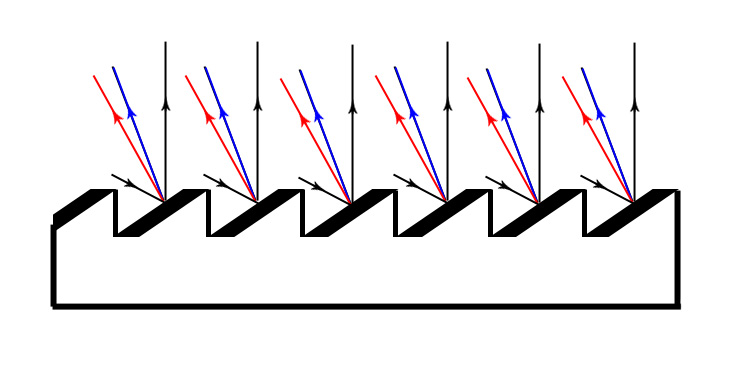 이 문제는 1900년대 초, 캐나다 오타와에 있는 도미니언 천문대의 존 스탠리 플래스킷이 고품질의 회절격자(격자)를 개발하면서 해결되었습니다.[93] 회절격자 위의 거울에서 빛은 모든 파장에서 동일한 각도로 입사하지만, 일부 빛은 다른 각도로 굴절을 일으킵니다. 이 각도는 거울 재료의 굴절률과 빛의 파장에 따라 달라집니다.[77] 다수의 평행 거울을 이용하는 블레이즈 회절격자를 제작하여 빛의 극히 일부를 집광하여 가시화할 수 있습니다. 이 새로운 분광기는 프리즘보다 더 상세한 스펙트럼을 얻을 수 있으며, 측정에 필요한 광량도 프리즘보다 적으며, 격자를 기울여 분광하는 파장대를 쉽게 조정할 수 있다는 점에서 우수합니다.[100]
