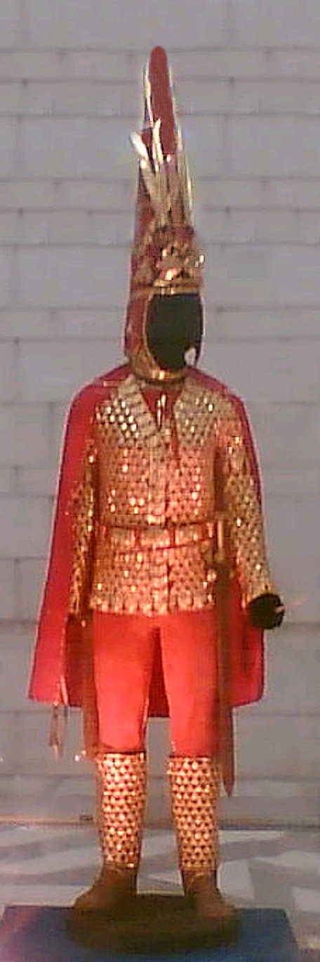 > ...모든 부대는 철로 덮여 있었고, 신체의 모든 부분은 두꺼운 판으로 덮여 있었는데, 뻣뻣한 관절이 사지 관절에 맞게 맞추어져 있었다. 그리고 인간의 얼굴 형태는 머리에 매우 능숙하게 맞추어져 있어서, 온몸이 금속으로 덮여 있기 때문에 그들에게 떨어진 화살은 눈동자 반대편의 작은 구멍을 통해 조금 볼 수 있거나 코끝을 통해 약간의 숨을 쉴 수 있는 곳에만 박힐 수 있었다. 이들 중 일부는 창으로 무장하여 마치 청동 클램프로 고정된 듯이 움직이지 않았다.[28]