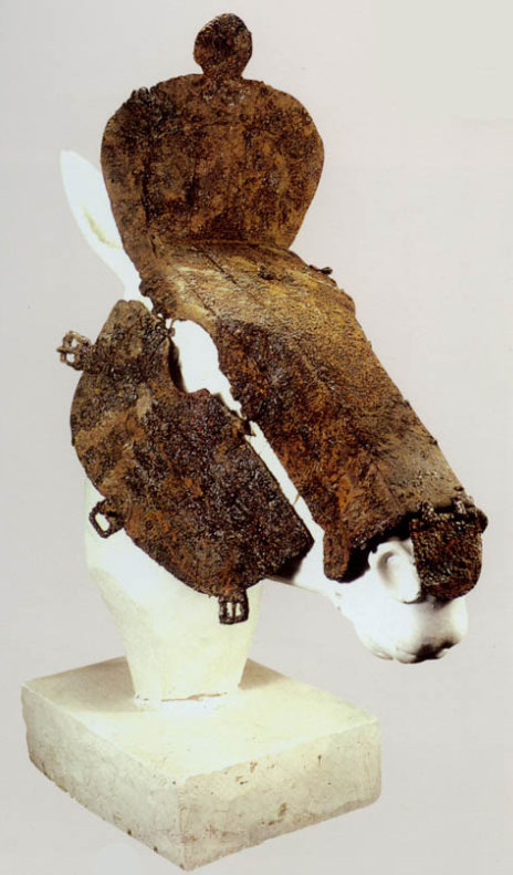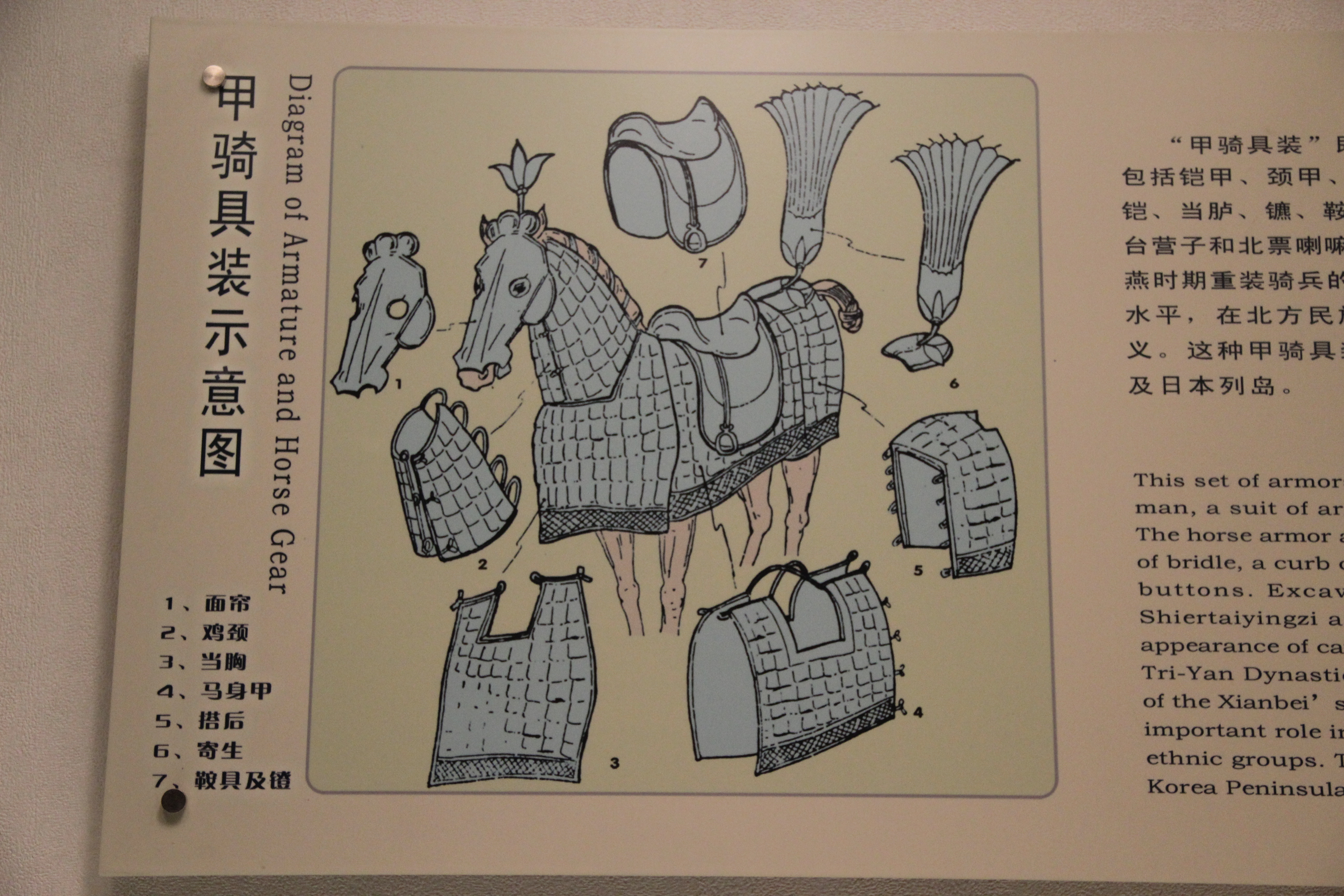 비늘 갑옷으로 덮인 말은 기원전 7세기에서 10세기 사이에 제작된 중국의 고대 시집인 ''시경''에 언급되어 있는데, 이 갑옷은 말 전체를 덮지 않았고 전통적으로 생각하는 것처럼 금속이 아닌 가죽으로 만들어졌을 가능성이 높다.[37][38][39][40][41] 금속으로 만든 말의 전신 갑옷은 삼국 시대 초기에 중국에서 사용되었을 수 있지만, 대부분의 기병 부대가 기동성을 필요로 했기 때문에 널리 채택되지는 않았다. 그러나 4세기 초에 이르러서야 내몽골과 랴오닝의 선비 부족 사이에서 철갑 기병이 널리 사용되기 시작했고, 이는 진나라 (266–420)와 남북조 시대에 중국 군대가 철갑 기병을 대규모로 다시 채택하게 되었다. 이 시대의 수많은 무덤 인장, 군사 조각상, 벽화, 공식 부조는 전쟁에서 갑옷 기병의 중요성을 증명한다.
