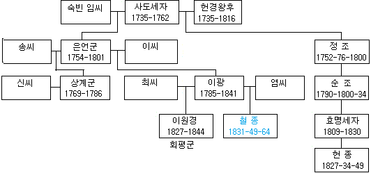 철종의 가계는 조선 왕실의 후손으로, 증조부는 영조이다. 할아버지 은언군은 정조의 이복 동생이었으나, 1786년 반역 혐의로 가족과 함께 강화도로 유배되었다. 은언군은 부인과 며느리가 가톨릭 신자라는 이유로 1801년 신유박해 때 처형되었다.[9][10]