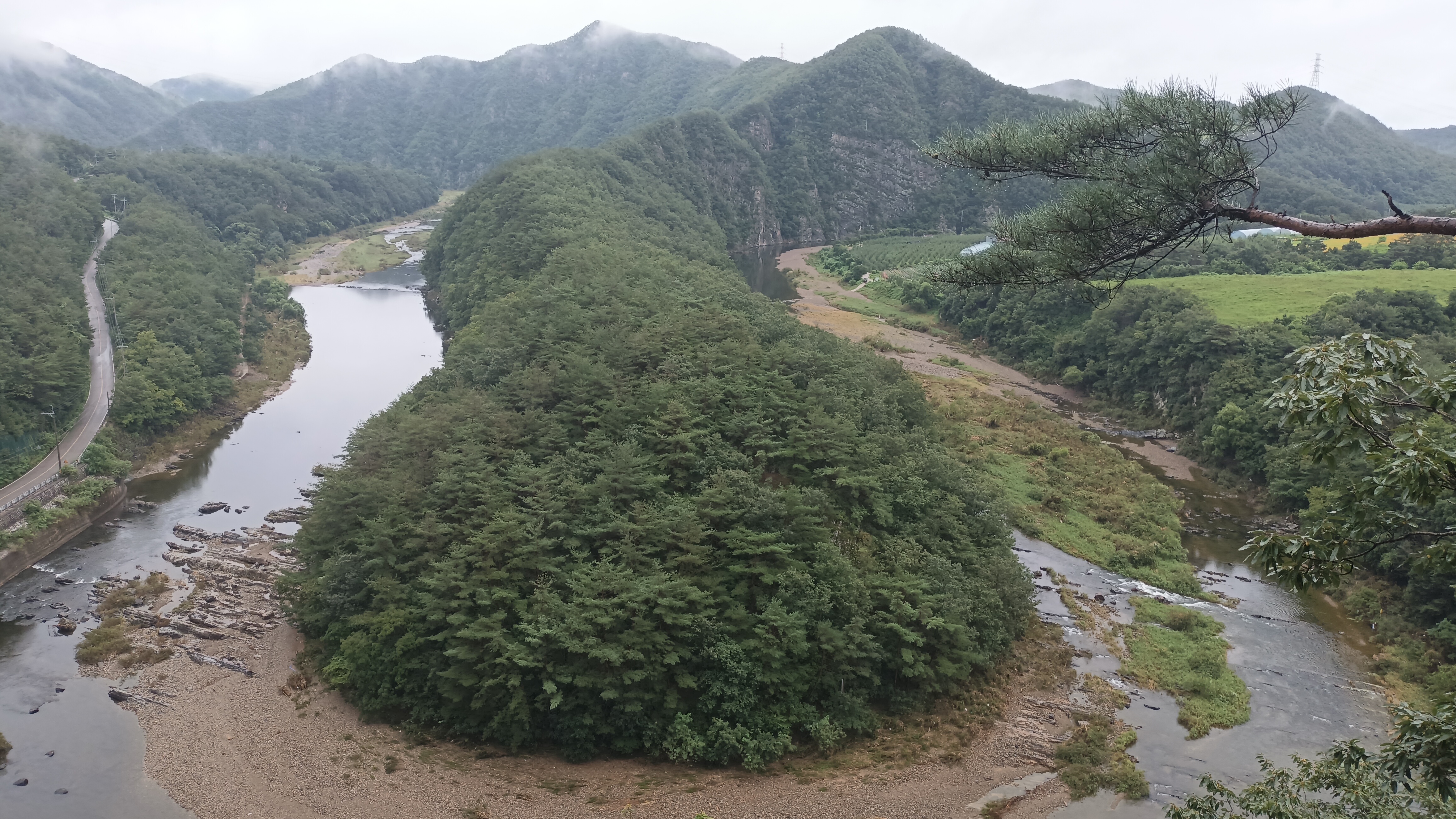 신성계곡 한반도 지형 전경. 멀리 보이는 절벽은 사곡층에 해당한다.