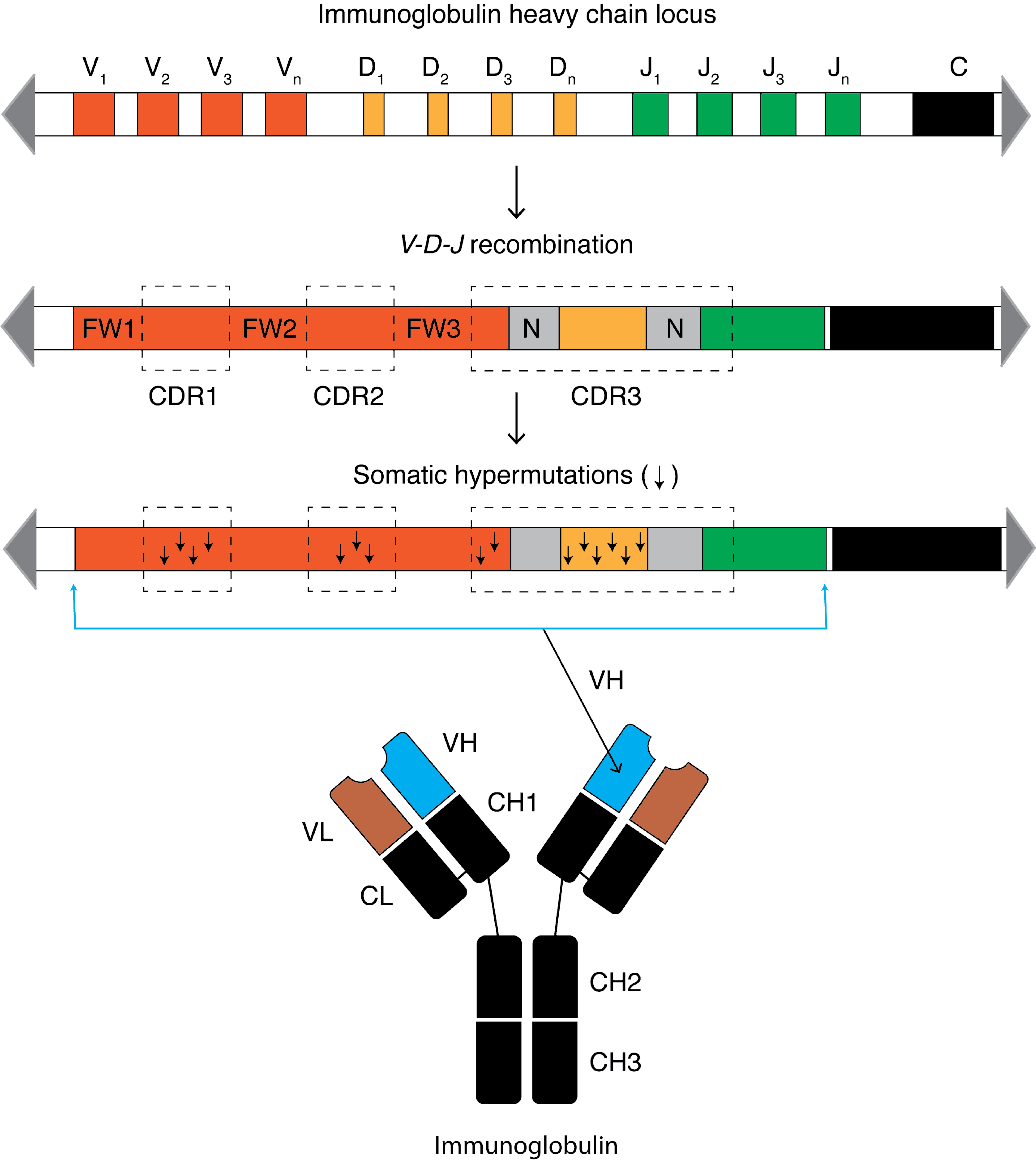 B 세포는 항원을 인식하면 분열(또는 증식)하도록 자극받는다. 증식하는 동안, B 세포 수용체 유전자 자리는 게놈 전체의 정상적인 돌연변이율보다 최소 105–106 배 더 높은 체세포 돌연변이율을 겪는다. 변이는 주로 단일 염기 치환 형태로 나타나며, 삽입 및 결실은 덜 흔하다. 이러한 돌연변이는 주로 DNA의 "핫스팟"에서 발생하며, 이는 과변이 부위에 집중되어 있다. 이 부위는 면역글로불린의 항원 인지에 관여하는 부위인 상보성 결정 부위에 해당한다.[6] 체세포 과돌연변이의 "핫스팟"은 돌연변이되는 염기에 따라 다르다. G의 경우 RGYW (즉, A/G G C/T A/T), C의 경우 WRCY, A의 경우 WA, T의 경우 TW이다.[7][8] 과돌연변이 과정의 전반적인 결과는 오류가 발생하기 쉬운 수리와 높은 충실도의 수리 간의 균형을 통해 달성된다.[9] 이러한 지향성 과돌연변이를 통해 특정 외부 항원을 인식하고 결합하는 능력이 향상된 면역글로불린 수용체를 발현하는 B 세포를 선택할 수 있다.[1]2. 2. 결과