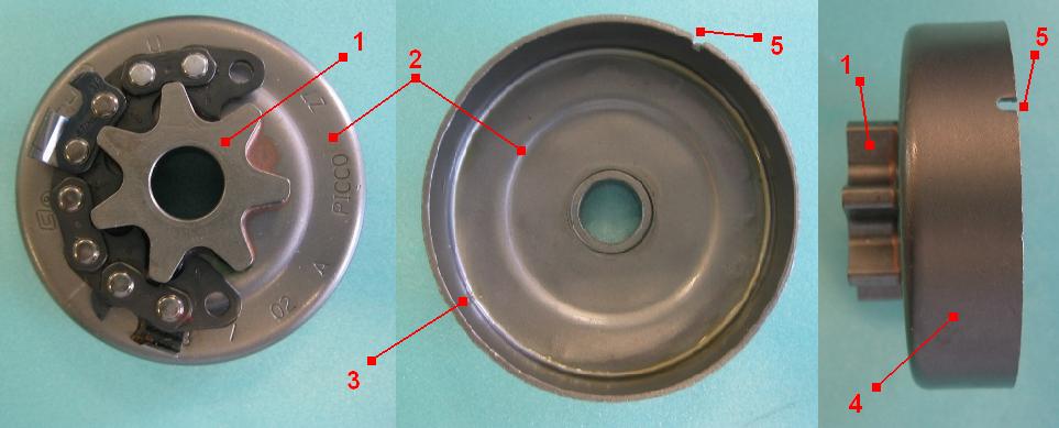 - '''원심 클러치 및 스프로킷''': 일반적으로 원심 클러치와 스프로킷이 사용된다. 원심 클러치는 엔진 회전 속도가 증가하면 팽창하여 드럼과 맞물리고, 이 드럼에 연결된 스프로킷이 체인을 회전시킨다. 클러치는 세 가지 중요한 역할을 한다. 첫째, 엔진이 아이들 상태(보통 2500–2700 rpm)일 때 체인이 움직이지 않도록 한다. 둘째, 체인이 나무 등에 걸려 멈추었을 때 엔진을 보호한다. 셋째, 킥백 발생 시 체인 브레이크가 드럼을 멈추면 클러치가 즉시 분리되어 작업자를 보호한다.