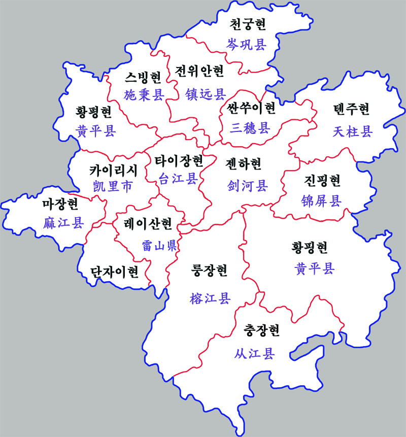 첸둥난 먀오족 둥족 자치주는 1개의 현급시와 15개의 현으로 구성되어 있다.현급시 현 카이리 시