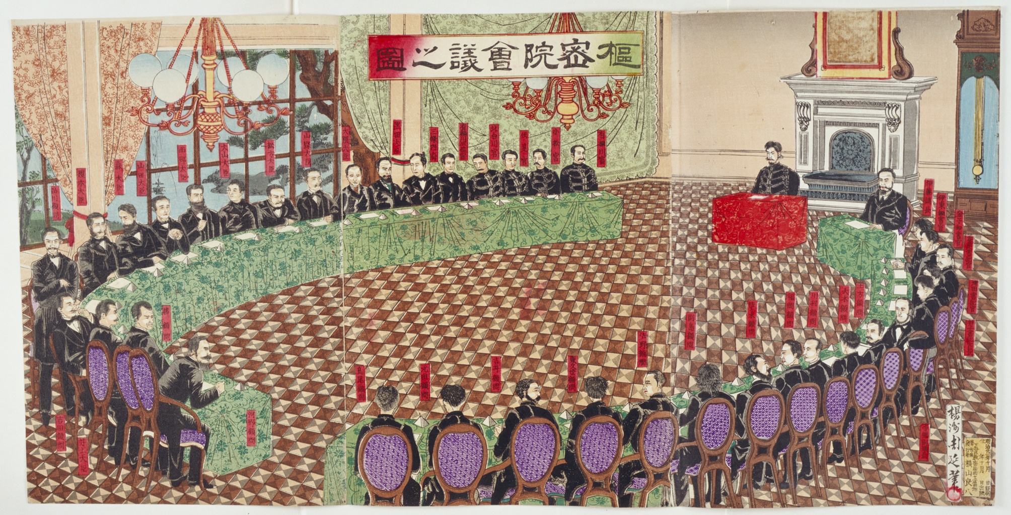 메이지 천황이 비밀 내각 의원들과 회의하는 모습. 우키요에 목판화, 요슈 치카노부 작, 1888년