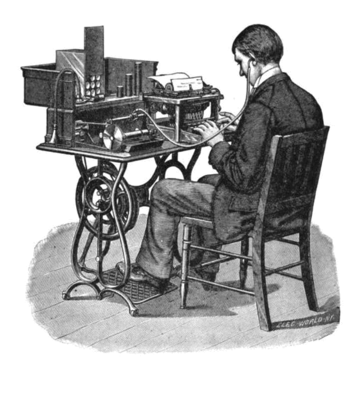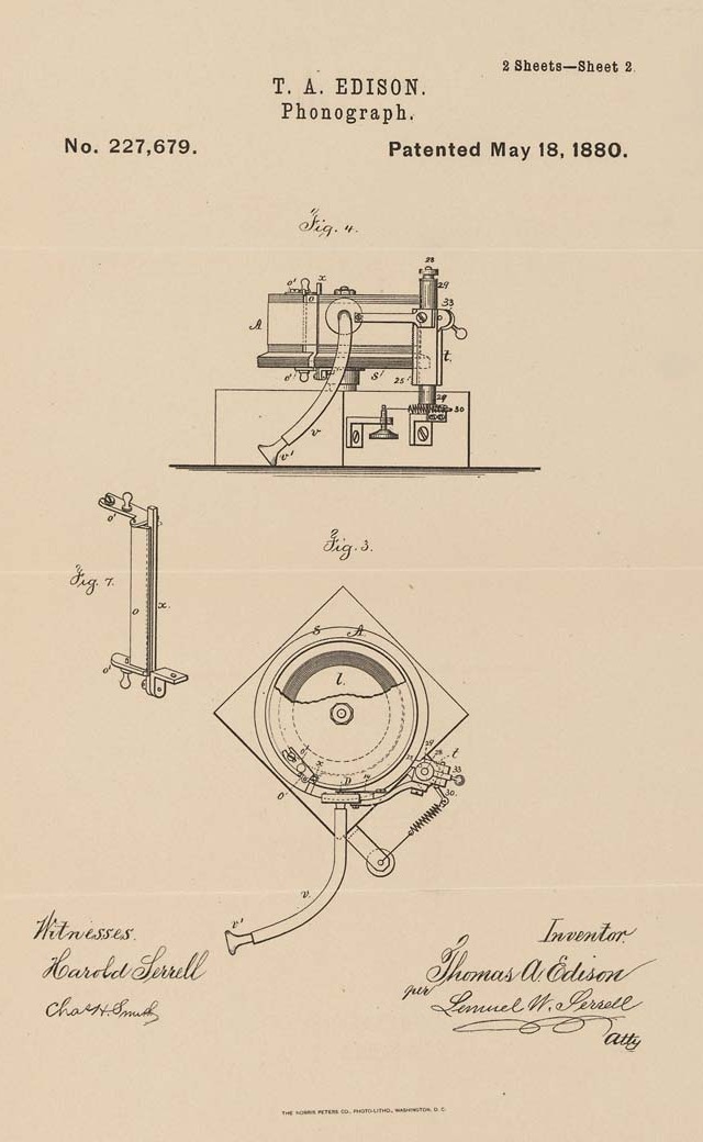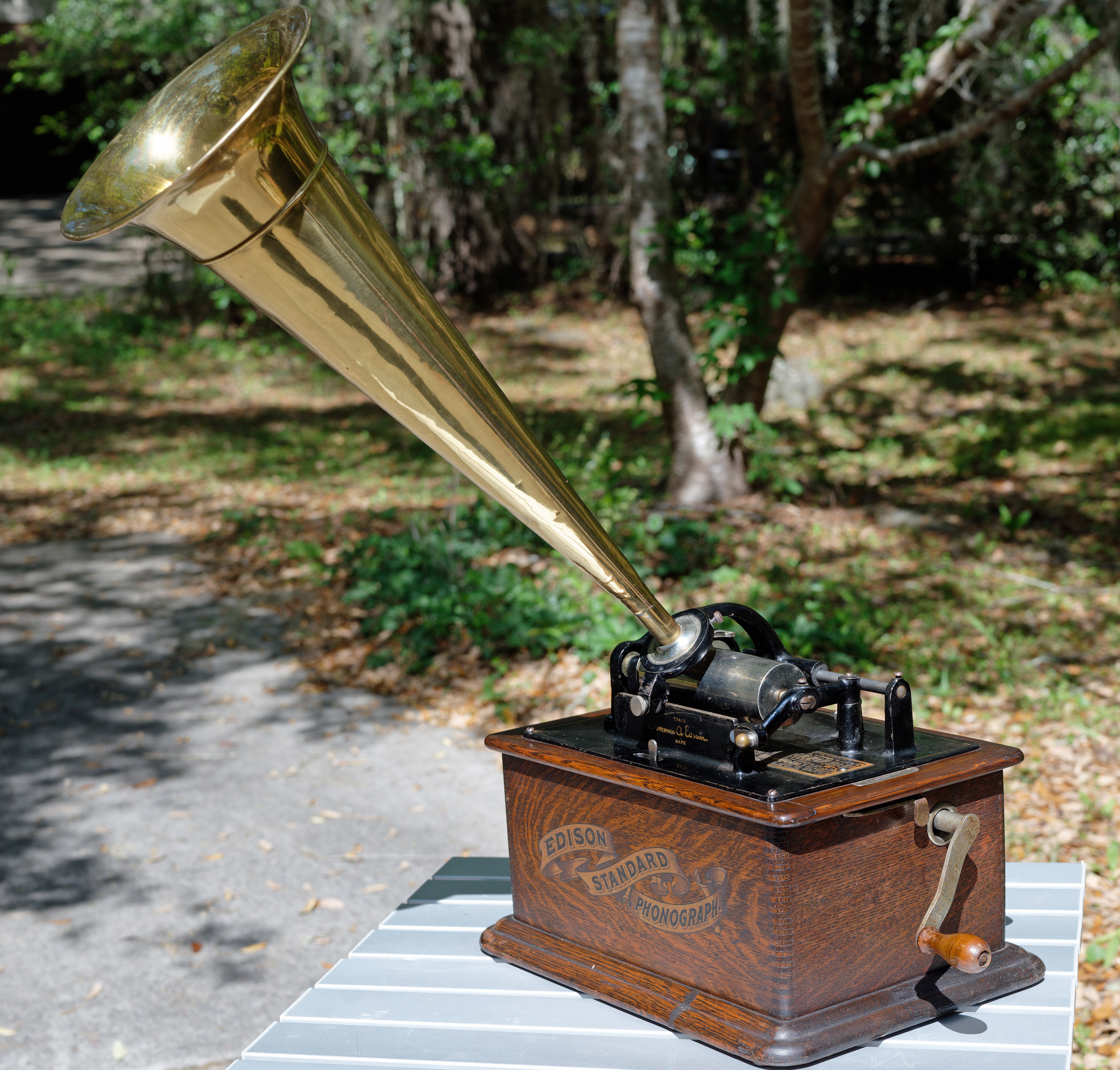 토머스 에디슨은 1877년 5월에서 7월 사이에 전신 메시지를 "재생"하고 전화로 전송하기 위해 음성 소리를 자동화하려는 노력의 부산물로 소리를 녹음하고 재생하는 원리를 구상했다.[29] 그의 첫 번째 실험은 왁스 종이를 사용했다.[30] 그는 1877년 11월 21일에 소리를 녹음하고 재생하는 장치인 최초의 ''축음기''를 발명했다고 발표했으며,[31] 11월 29일에 이 장치를 처음 시연했다. 이 발명은 1878년 2월 19일에 미국 특허 200,521호로 특허를 받았다.