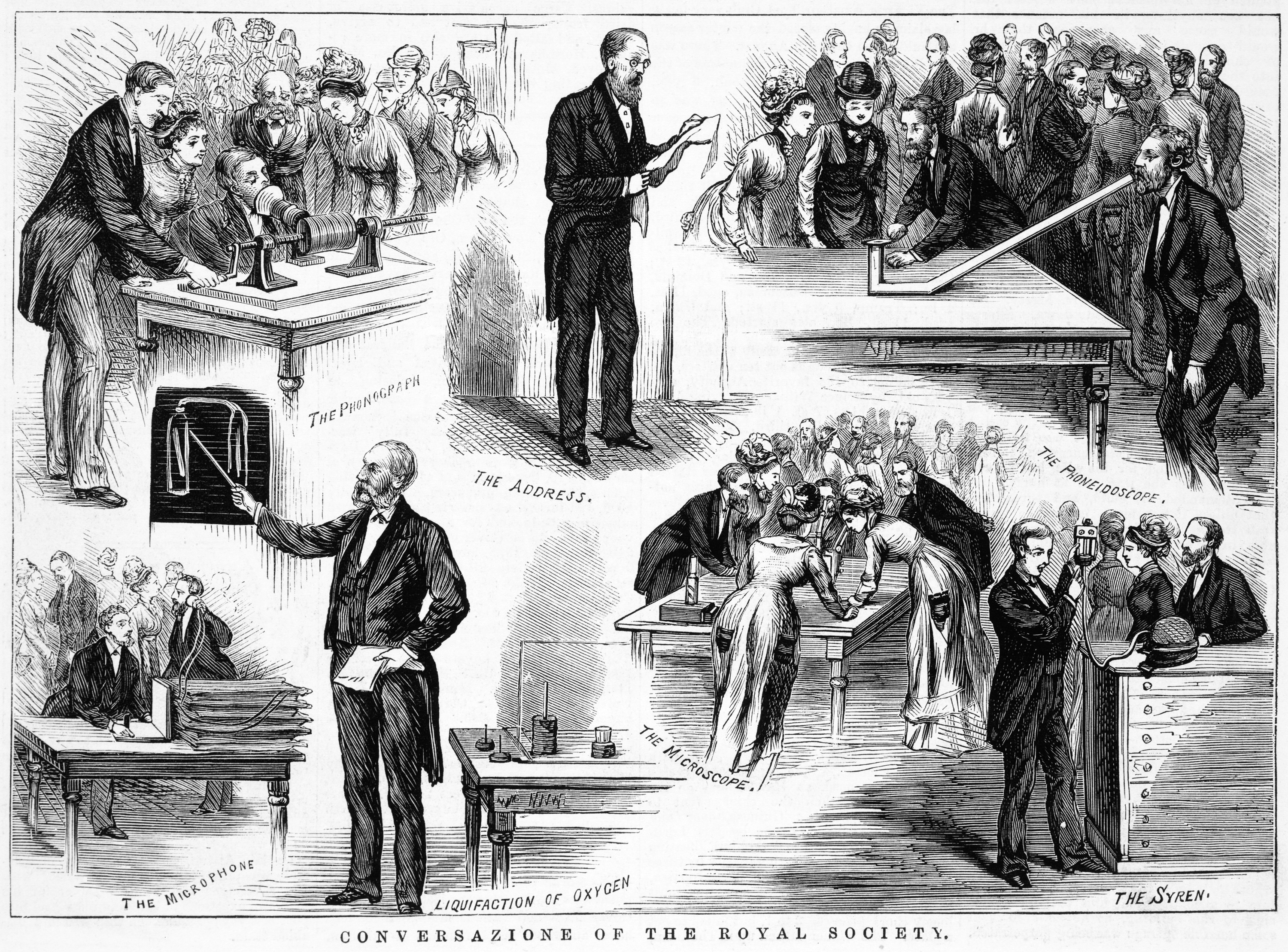 토머스 에디슨은 소리의 진동을 주석박에 새겨 녹음하고 재생하는 주석박식 포노그래프를 발명했다.[95][96] 이 아이디어는 LP 레코드까지 이어진다.[95] 에디슨은 1878년 1월에 에디슨 스피킹 포노그래프사를 설립했다.[96] 그러나 최초의 포노그래프는 주파수 특성이 좁고, SN비도 나빴으며, 재생을 반복하면 SN비가 급격히 저하되는 등 정밀도가 매우 불충분했다.[95] 이후 에디슨은 백열전구 개발에 집중하여 포노그래프 연구 개발은 잠시 중단되었다.[95]