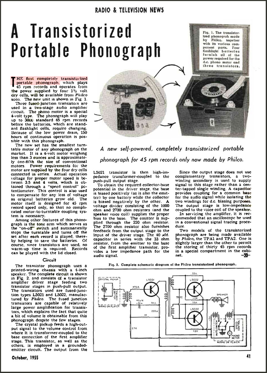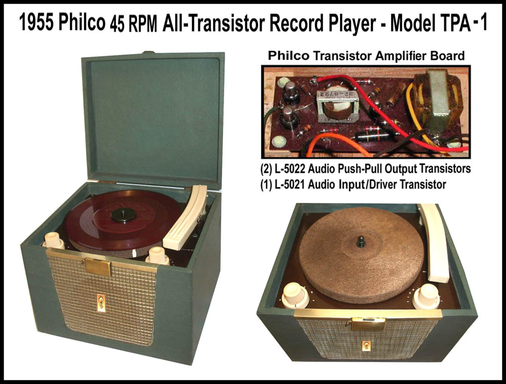 1955년, 필코(Philco)는 세계 최초의 완전 트랜지스터 축음기 모델 TPA-1과 TPA-2를 개발 및 생산했으며, 이는 1955년 6월 28일자 ''월스트리트 저널(The Wall Street Journal)''에 발표되었다.[57] 필코는 1955년 가을에 이 완전 트랜지스터 축음기를 59.95USD에 판매하기 시작했다. 1955년 10월호 ''Radio & Television News'' 잡지 (41페이지)에는 필코의 새로운 소비자 제품에 대한 상세한 기사가 실렸다. 완전 트랜지스터 휴대용 축음기 TPA-1 및 TPA-2 모델은 45rpm 레코드만 재생했으며, 전원 공급 장치로 1.5볼트 "D" 배터리 4개를 사용했다. "TPA"는 "Transistor Phonograph Amplifier(트랜지스터 축음기 앰프)"의 약자이다. 이 제품의 회로는 3개의 필코 게르마늄 PNP 합금 융합 접합 오디오 주파수 트랜지스터를 사용했다. 1956년 시즌이 끝난 후, 필코는 트랜지스터가 진공관에 비해 너무 비싸다는 이유로 두 모델 모두 단종하기로 결정했다.[58][59] 그러나 1961년에는 7개의 트랜지스터를 사용한 49.95USD짜리 휴대용 배터리 전원 라디오-축음기를 사용할 수 있었다.[60]